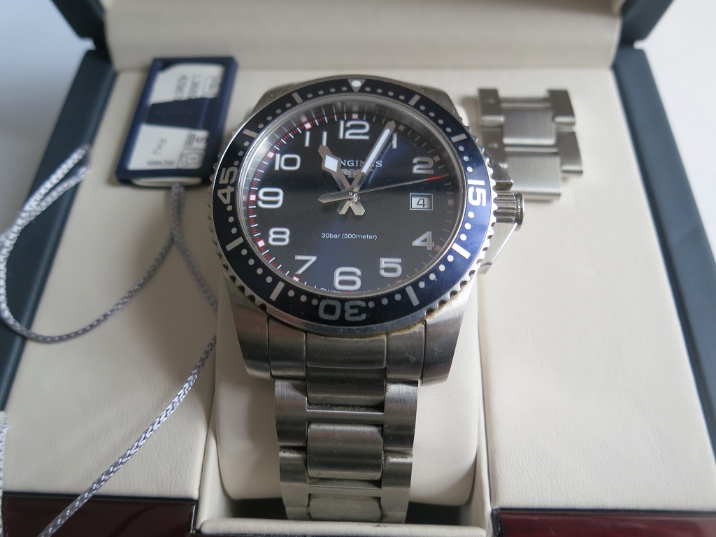 В продаже часы из модельного ряда Sport от старейшей швейцарской часовой марки Longines. Эта версия HydroConquest имеет строгий и лаконичный темно синий циферблат с полным рядом арабских цифр. что придает дайверским по сути часам толику авиаторского стиля. Стальной браслет, в отличии от выпускаемой сейчас версии, выполнен в более стойком к царапинам сатинированном варианте, а также немного сужается к застежке. Высокоточный, надежный кварцевый механизм L115 (на основе ETA 955.112). Диаметр 41 мм. Водозащита 300 м. Сапфировое стекло с антибликом. На завинчивающихся заводной головке и задней крышке гравировка логотипа Longines- песочные часы с крыльями.