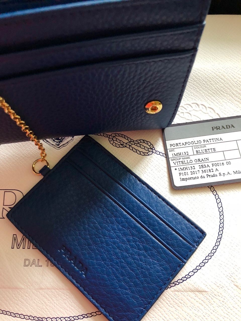 Коллекция 2017-2018 года, со встроенными визитницами, которые у PRADA отдельно стоят не менее 8-12т.р. Мягкая зернистая кожа, выделки VITELLO GRAIN, очень ноская и стойкая к царапинам. Портмоне полноценного формата, 19см на 9,5см. Насыщеного темно-синего цвета Bluette, с золотым металическим лого на клапане.