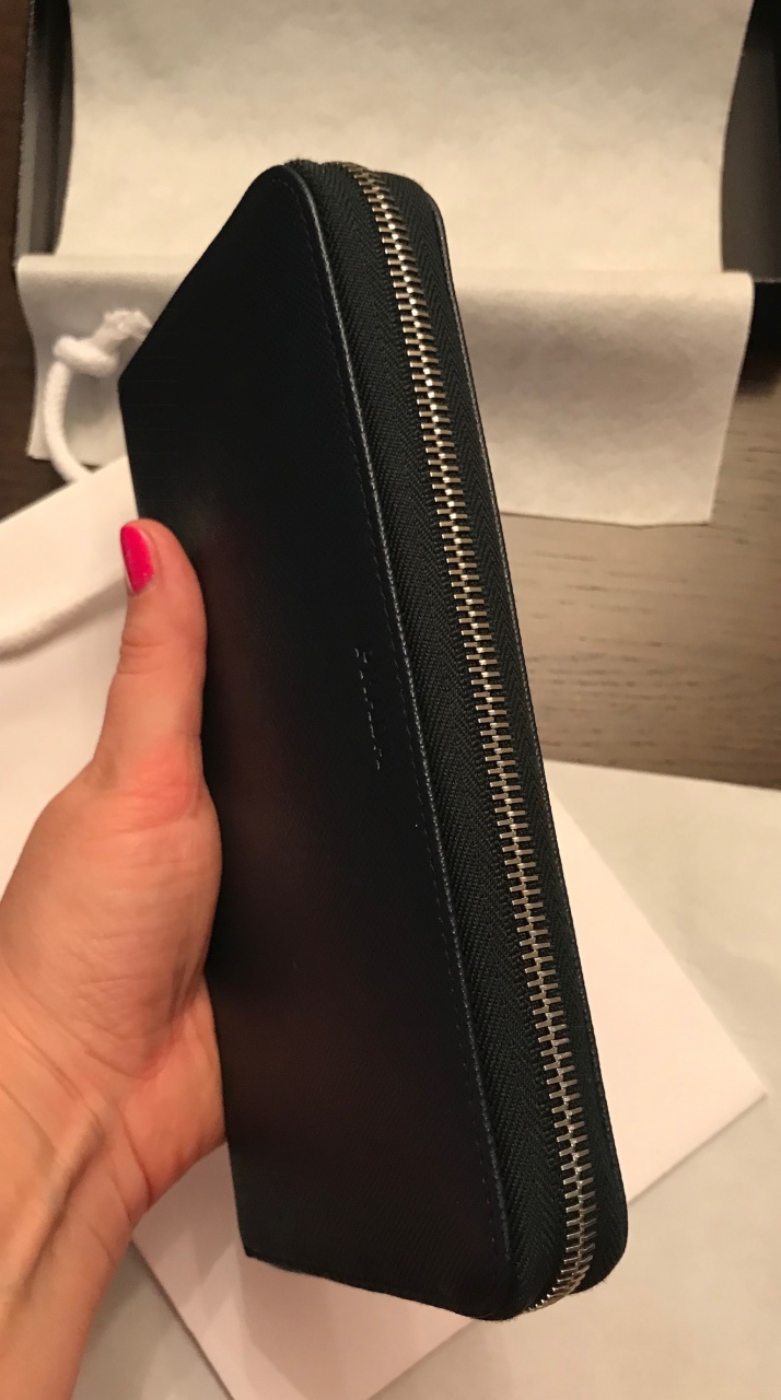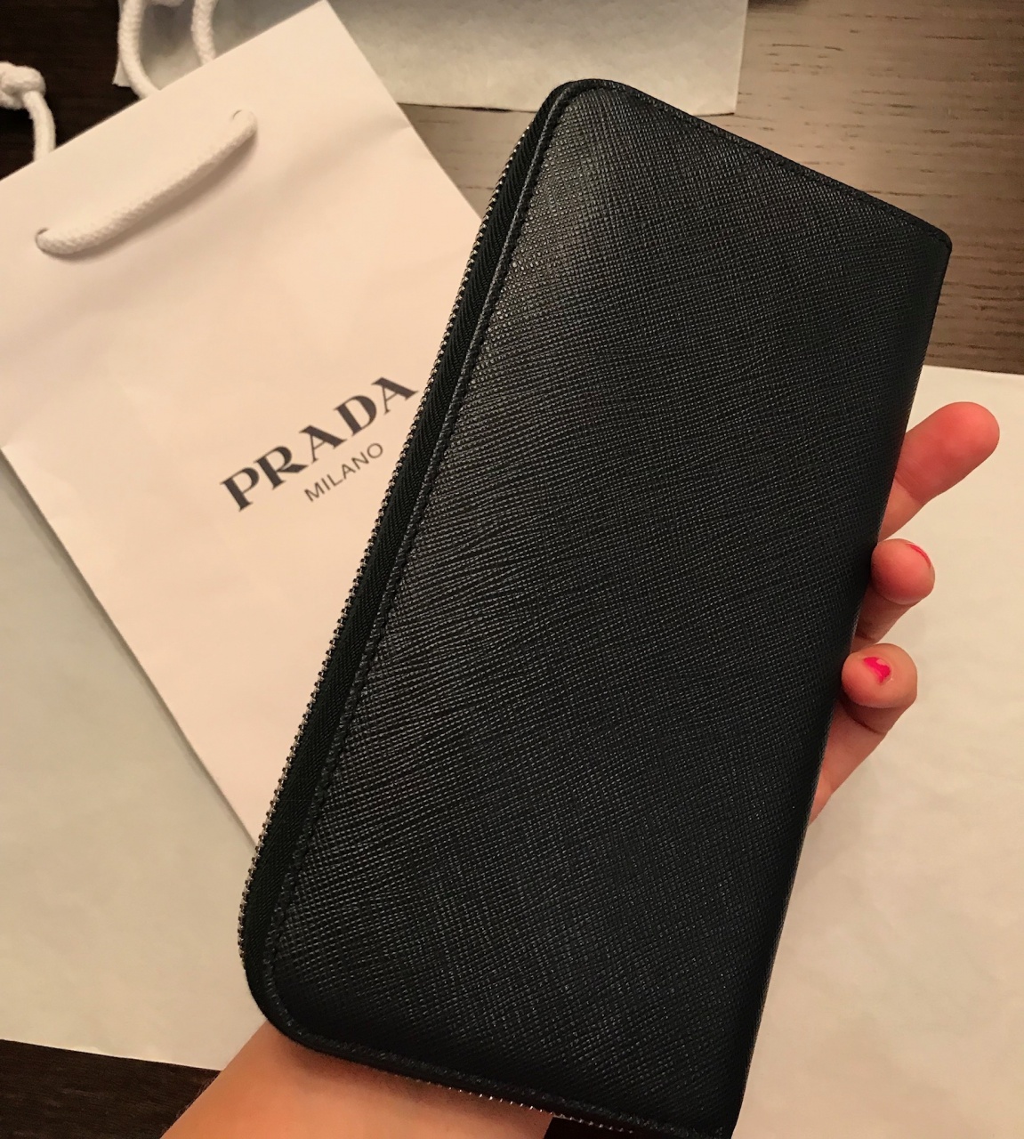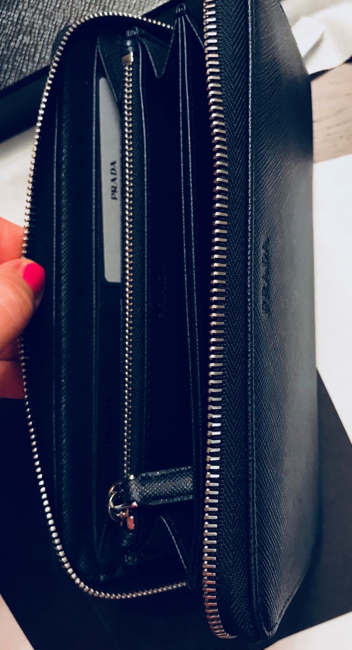 Легендарная кожа Saffiano, тисненый логотип, три больших продольных отделения, одно большое отделение на молнии, 12 слотов для кредитных карт, внутри отделка синим шелком и кожей. Размеры 10 см на 20 см, ширина 2 см. Легко влезает документы, права, паспорт, ПТС и тд. Красиво смотрится в руке или в деловом портфеле.