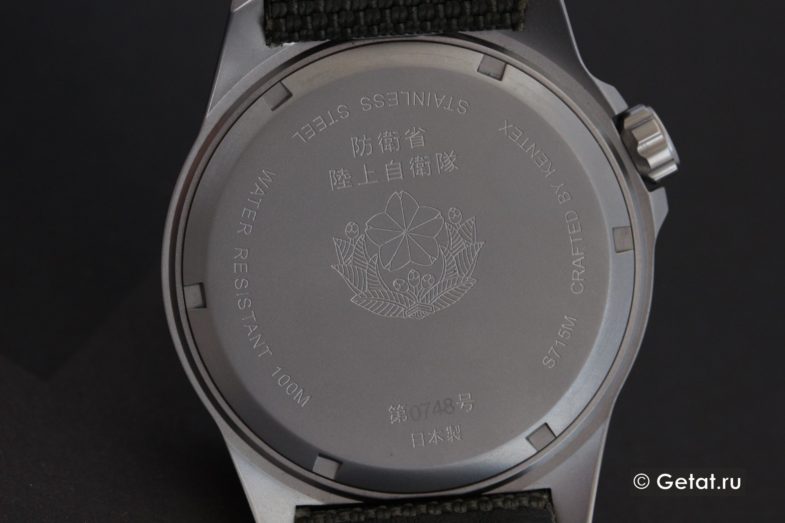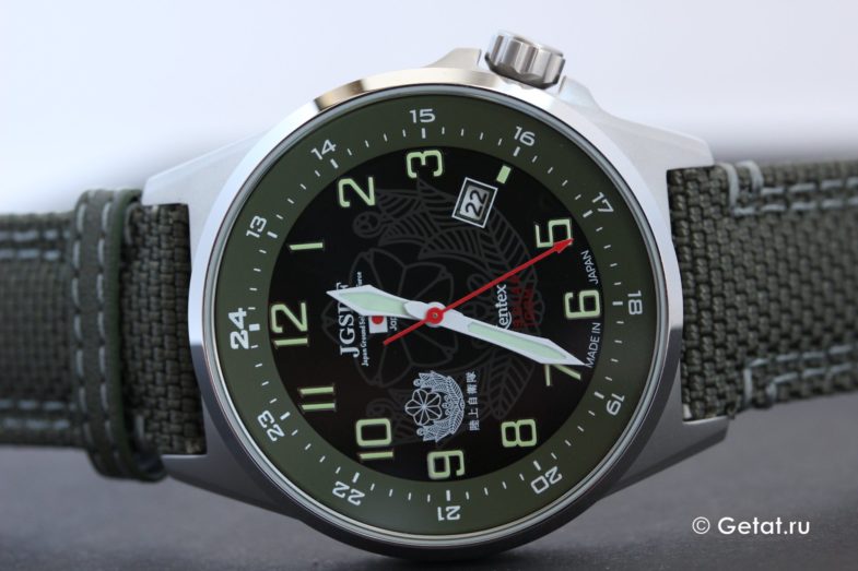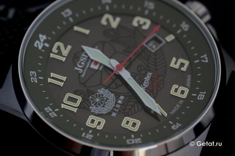 Циферблат крупный и благодаря большому размеру на нем умещаются и часовая шкала, и шкала «24 часа», и пара логотипов, в том числе Минобороны Японии. Ну и лого Kentex. Стрелки крупные, читаемость отличная. Окошко даты мелковато, но и дату видно в целом хорошо. Метки и стрелки покрыты люминофором, яркость и продолжительность свечения средненькая.