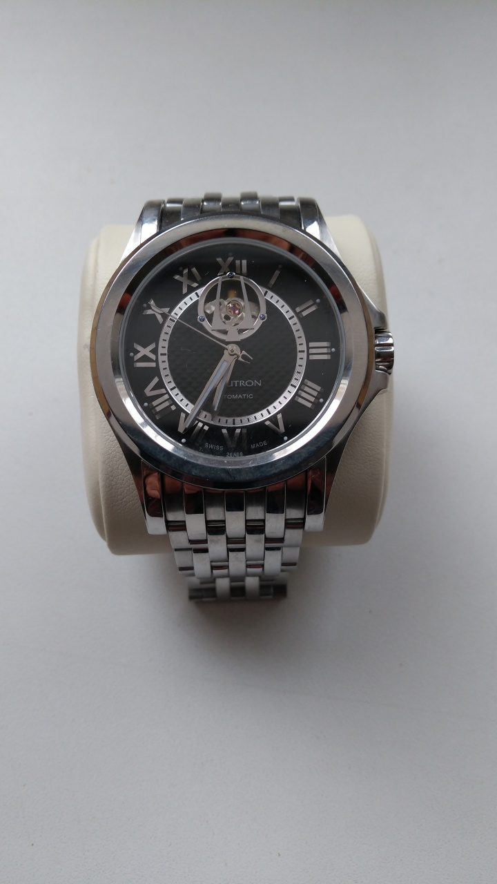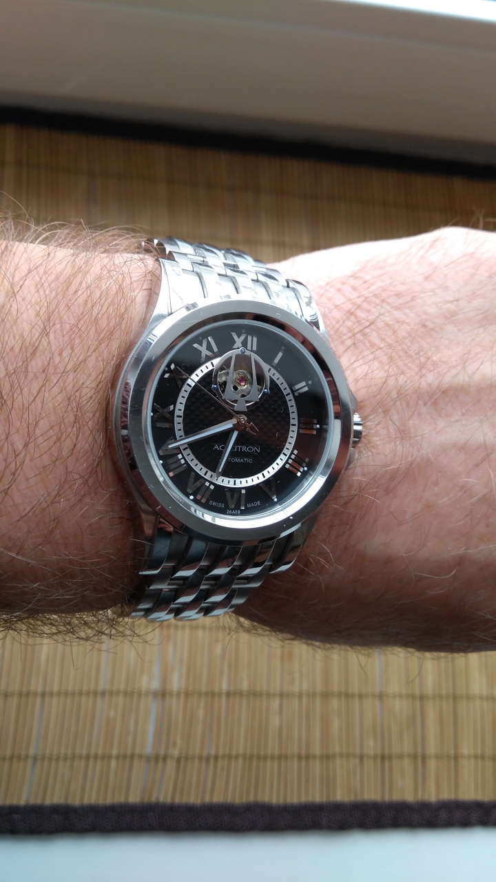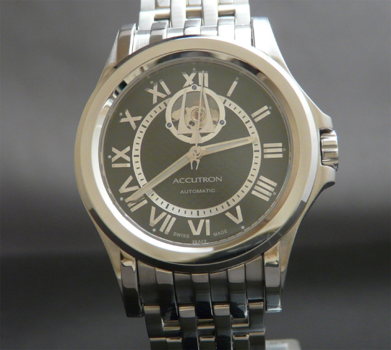 Аккутрон «Близнецы» модель 26A09 имеет черный частично скелетонированный циферблат с нанесенными полированными римскими маркерами. ETA частично скелетонированная версия 2824-2 с логотипом Accutron, покрывающим окно наблюдения.