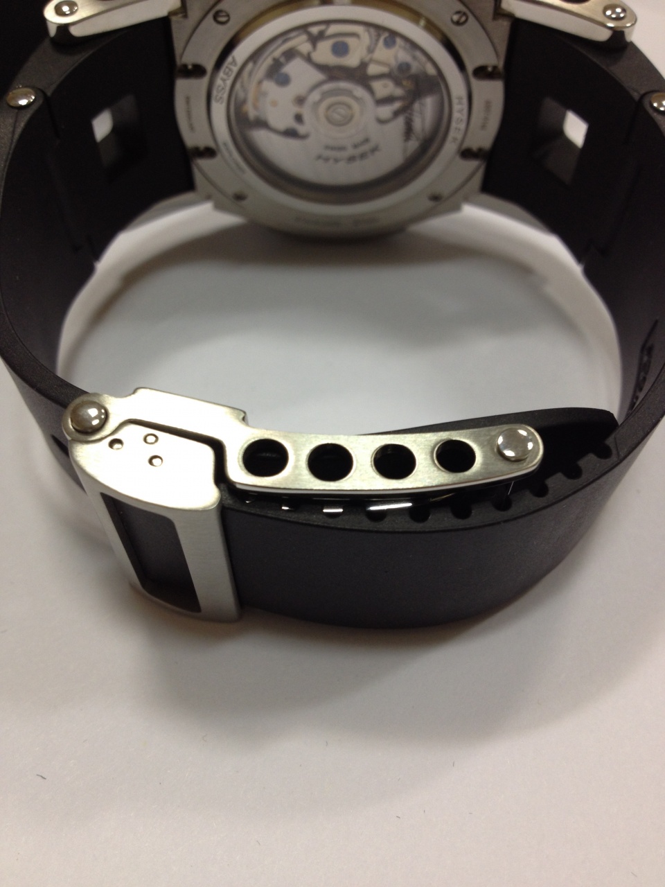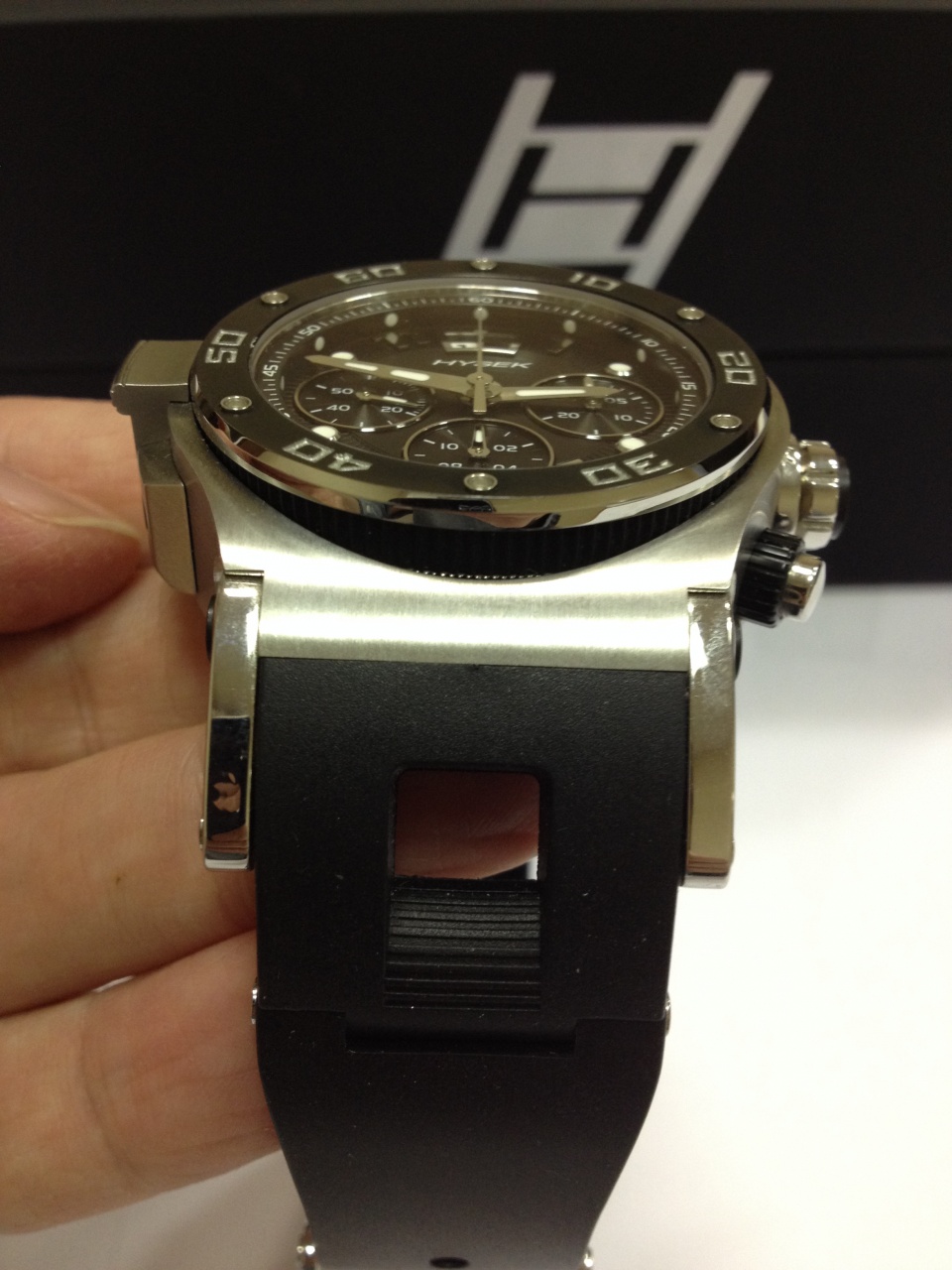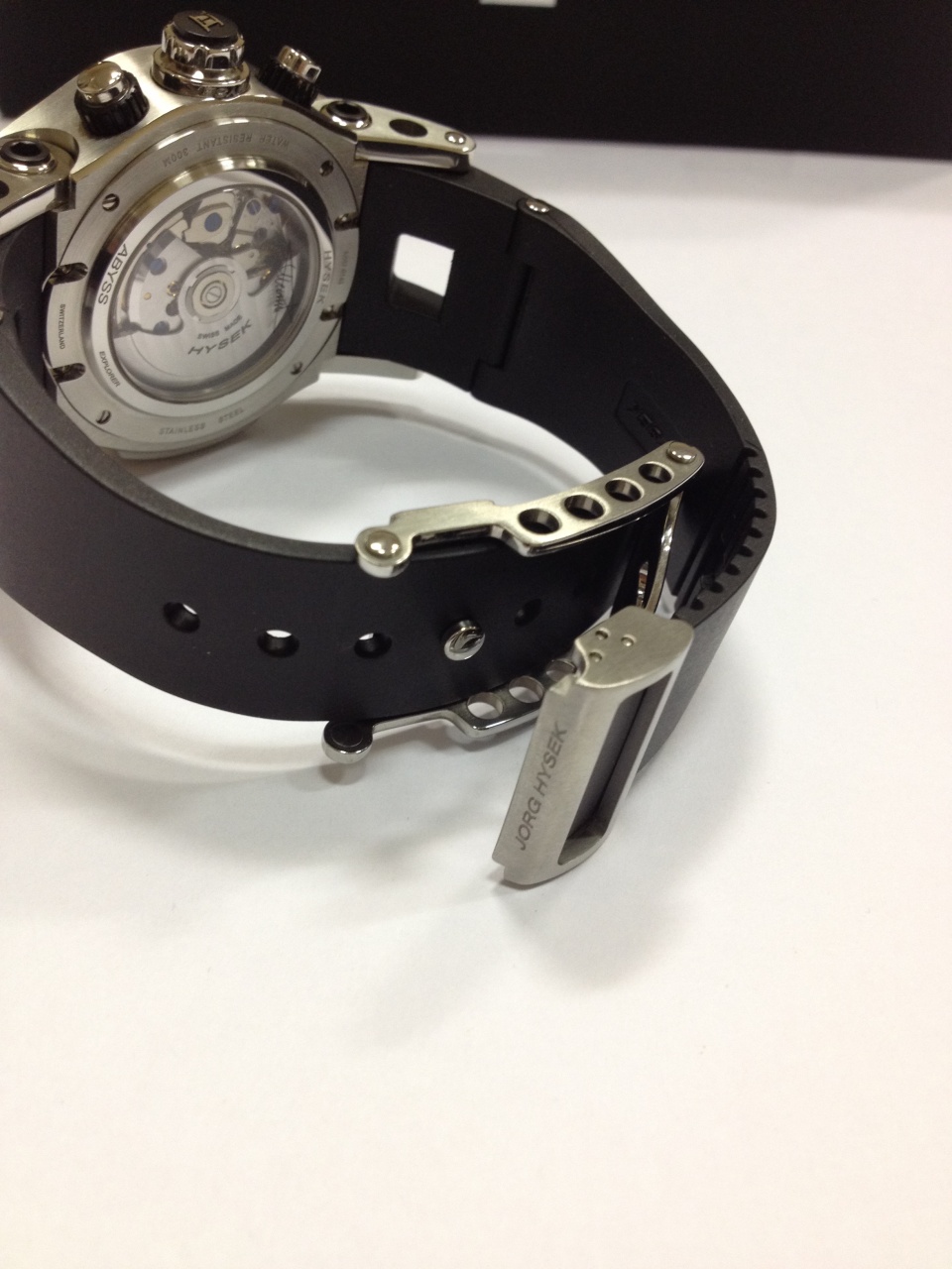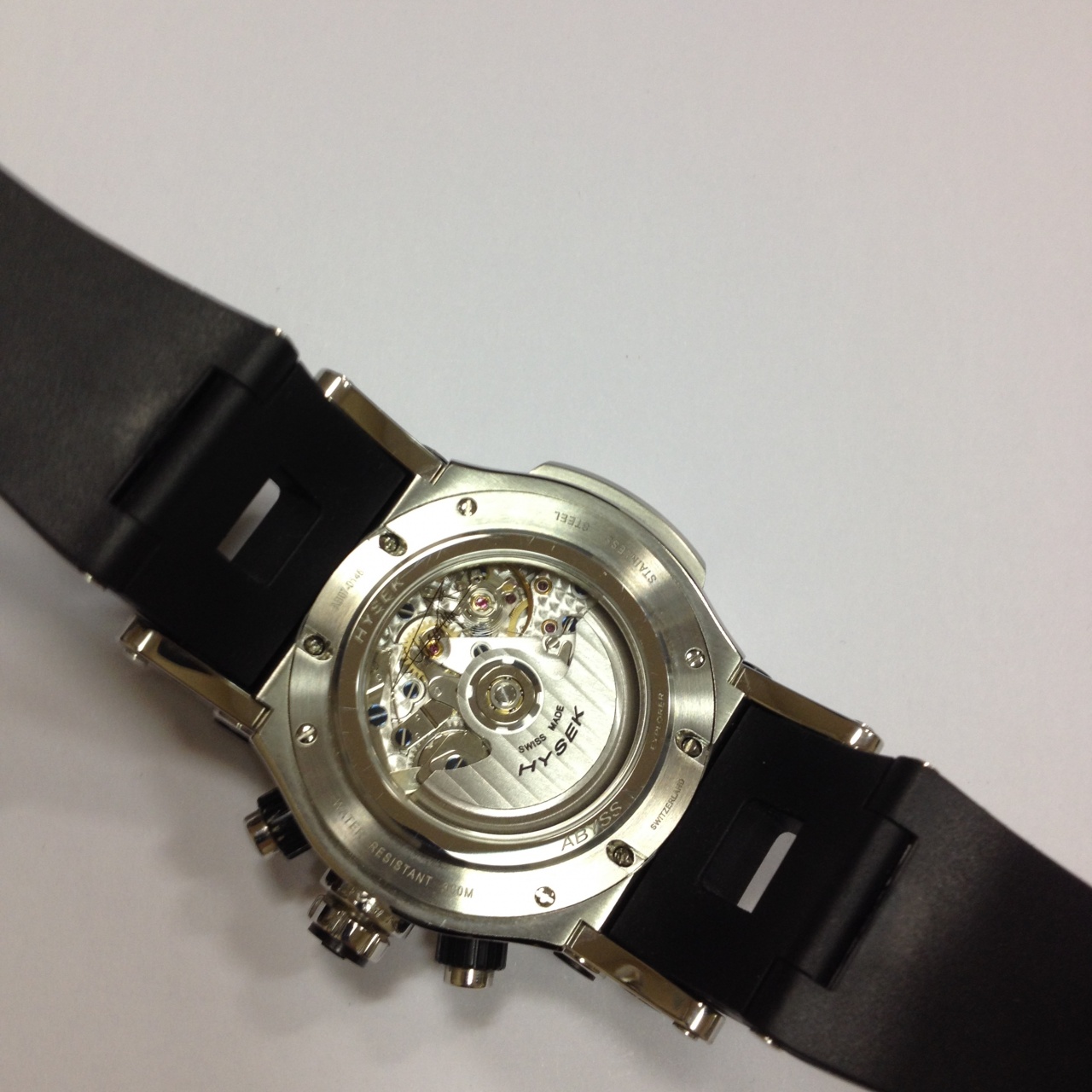 Настоящий мужской хронограф с большой датой. Автоматический механизм. Стальной корпус диаметром 44 мм. Водонепроницаемость 300 м. Закручивающиеся головка и кнопки хронографа. Уникальная система фиксации вращающегося безеля. Антибликовое сапфировое стекло. Каучуковый ремешок с браслетной застёжкой.