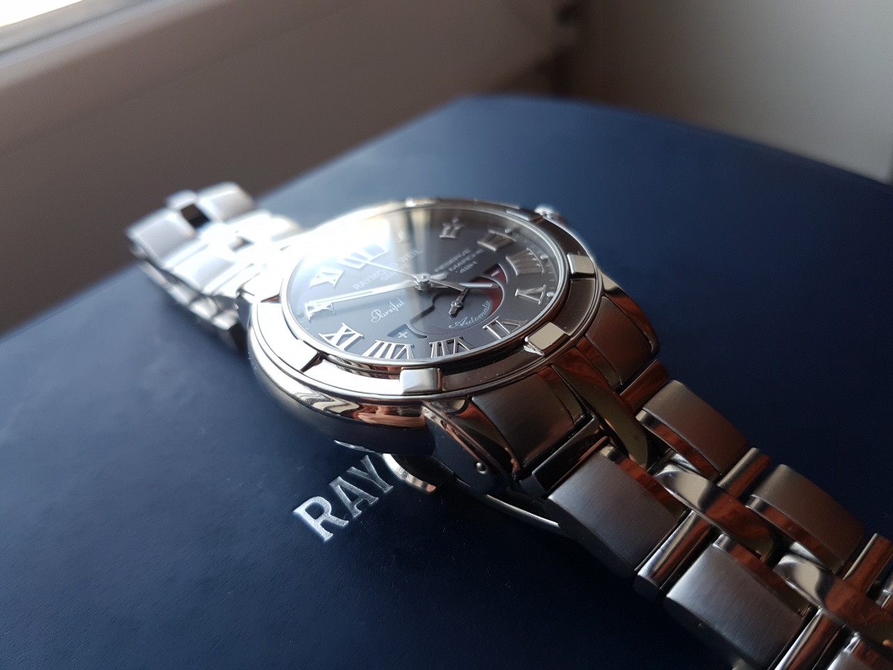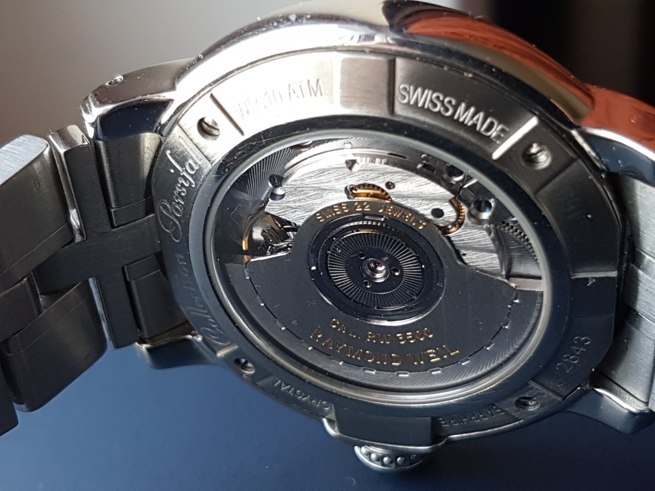 Часы действительно очень красивые с тщательной и виртуозно исполненной отделкой как в целом, так и отдельных элементов. Цвет циферблата серый, отлично сочетающийся со сталью и подходящий практически к любому цветовому решению гардероба. Цифровые индексы и метки, а так же апертура даты накладные. На стрелках и метках люминесцентное покрытие. В заводной головке установлен темно-синий сапфир(матовый и не прозрачный), который совершенно не бросается в глаза и придает роскошный вид. Задняя крышка из сапфирового стекла через которую виден красиво декорированный механизм.
