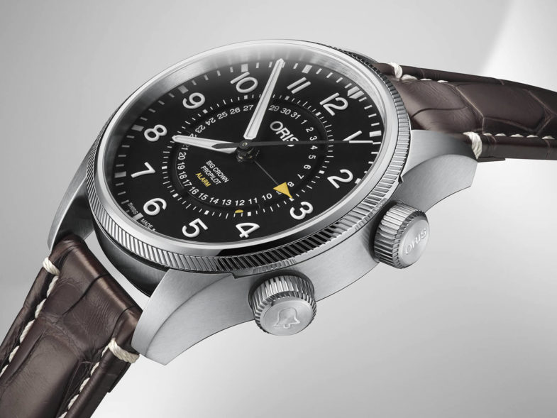 Форма 44 мм корпуса повторяет другие модели ProPilot серии, однако, со своими особенностями. Здесь мы видим две заводные головки, одна из которых управляет будильником. Большой плюс, что на ее торце есть гравировка, которая позволяет ее отличить от обычной заводной. Пользуясь в свое время стареньким Полет-сигнал, я неоднократно их путал )). Время, срабатывания будильника выставляется дополнительной стрелкой с желтым треугольным наконечником. Также обращает на себя внимание необычный круговой указатель даты, каковой мы могли лицезреть у недавней дайверской лимитки Oris Source of Life.