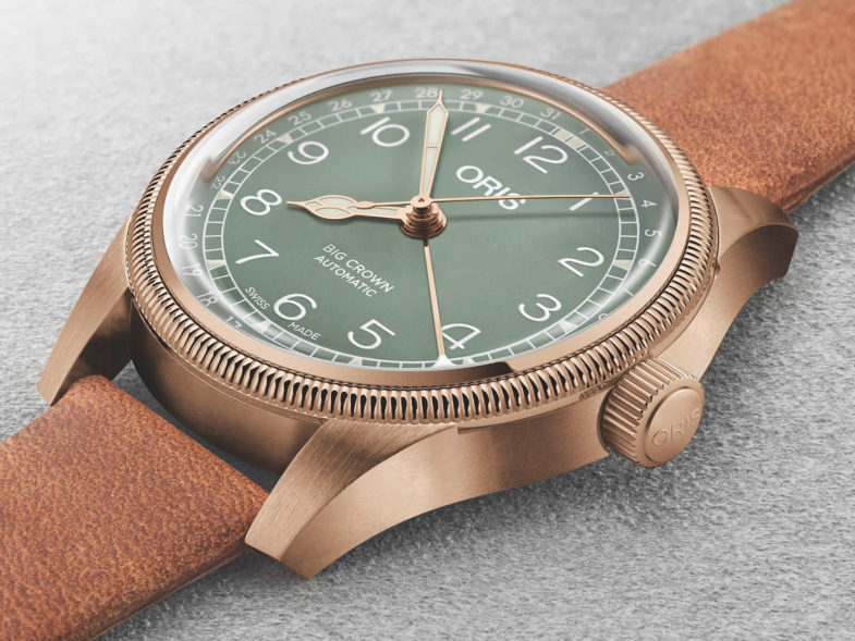 И напоследок поговорим о знаковой модели, которая ведет родословную с 1938 года, это Oris Big Crown Pointer Date, созданная по мотивам пилотских первых часов компании, давших название линейке, существующей и по сей день. Те исторические часы Big Crown 1938 года, имели указатель числа месяца, выполненный в виде дополнительной стрелки и соответствующей разметки по внешнему кругу циферблата. Кроме того, большая заводная коронка ставшая символом, а потом и названием серии, облегчала работу с часами в кожаных летных перчатках. Стоит добавить, что в прошлом году выходила приятная, зеленая лимитка Oris Big Crown Pointer Date D.26 286 HB-RAG Limited Edition, которая понравилась многим, и вот теперь мы дождались серийной модели, и в этом цвете, также.