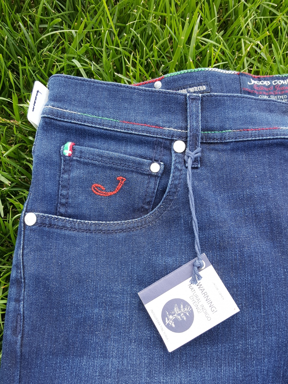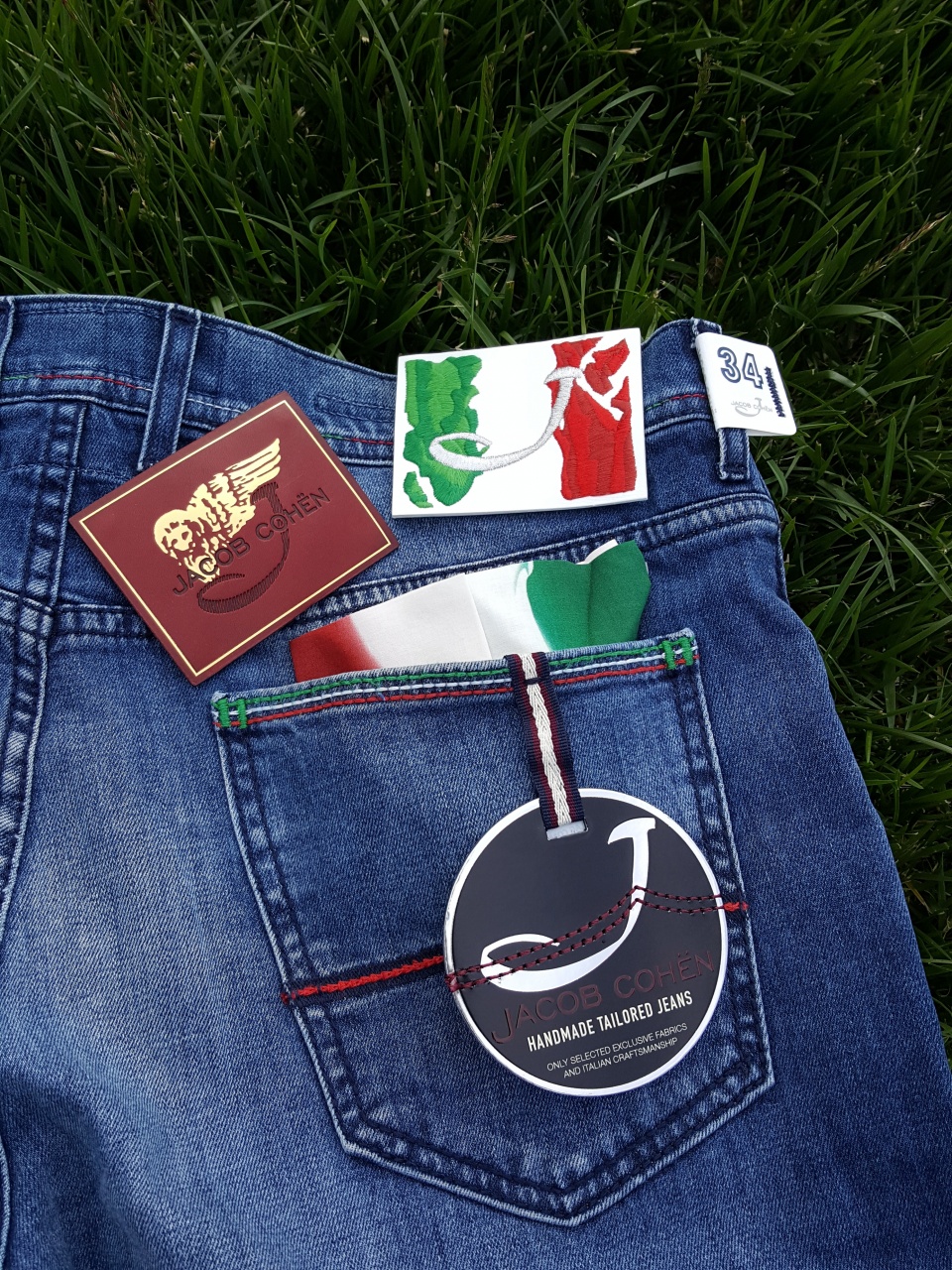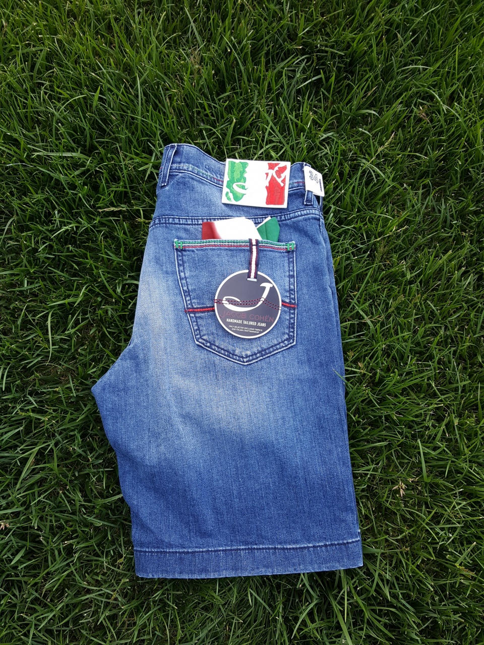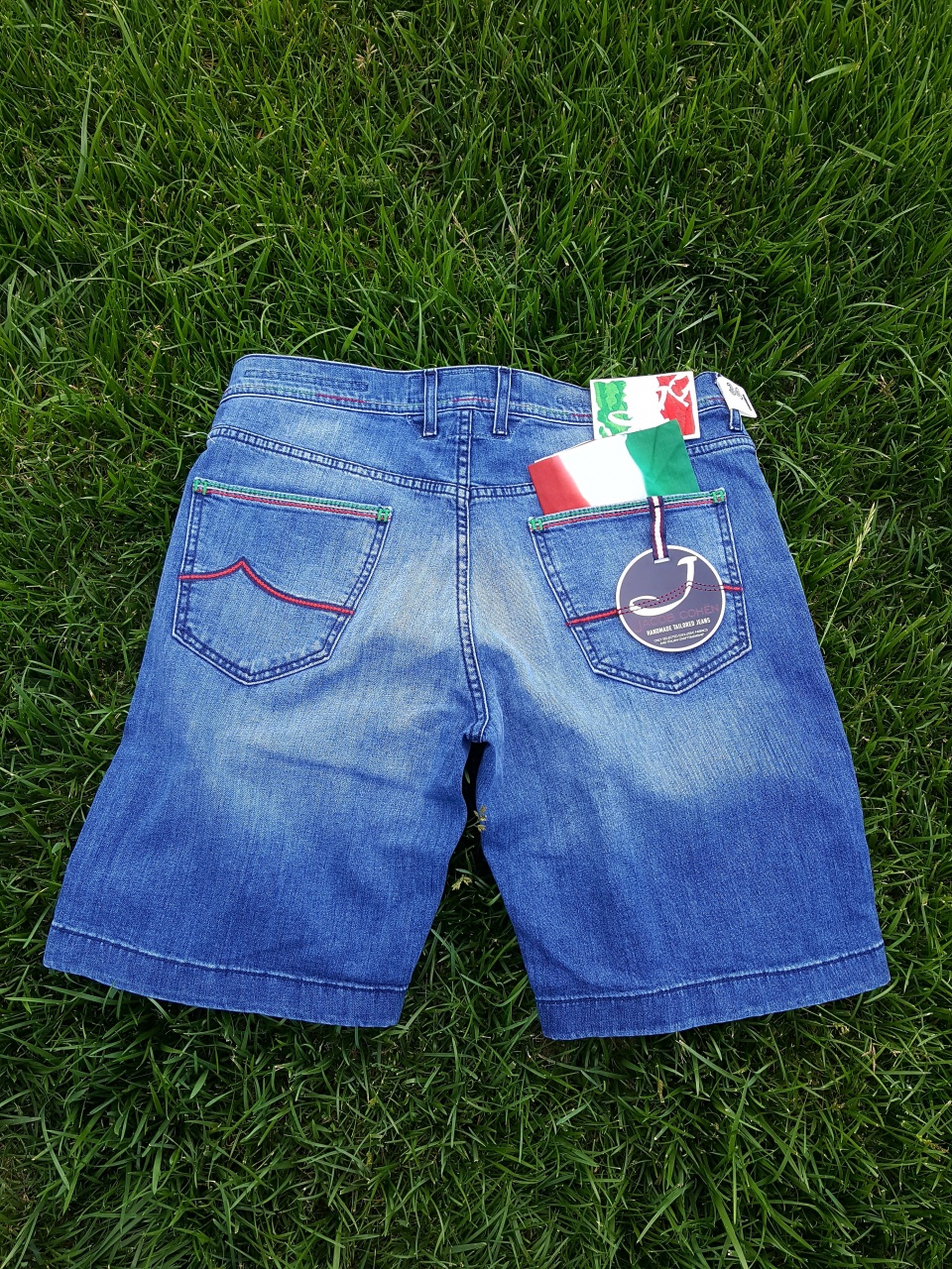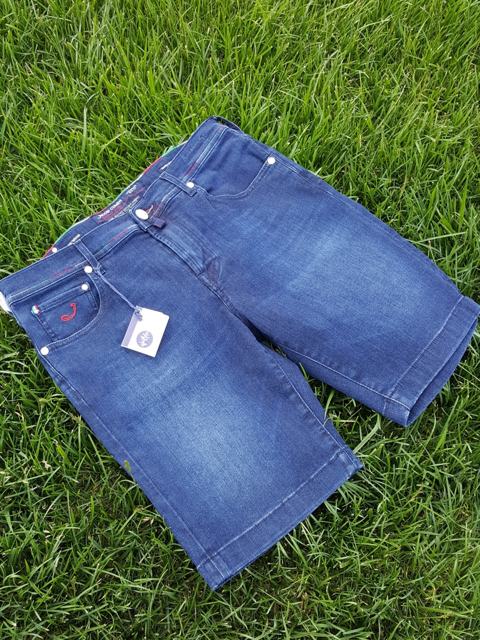 Сзади на правом бедре джисовые шорты имеют ОТСТЁГИВАЮЩИЙСЯ (рекомендуется снимать перед стиркой) фирменный ярлык из кожи с вышитым цветными нитками итальянским флагом и буквой «J», что указывает на принадлежность к "премиальной" линейке марки!!!