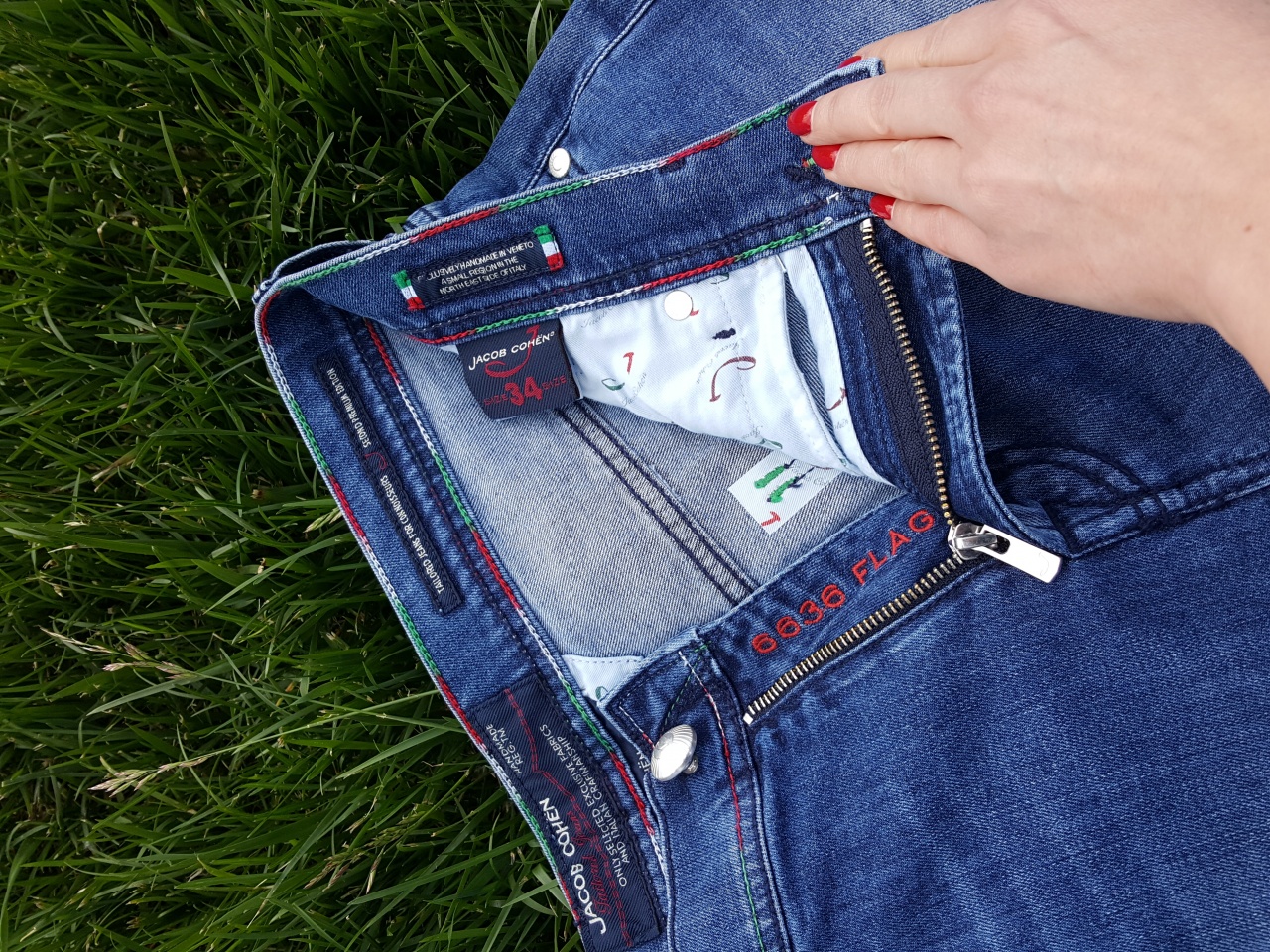 Модель: 6636 FLAG, прямого кроя, застёгивается на фирменную пуговицу из серебра с логотипом Jасоb Соhёn и металлическую молнию с фирменным бегунком с изображением символа марки - буквы «J».