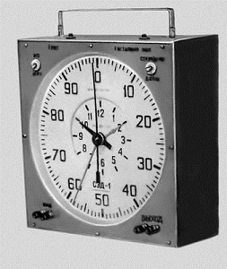 Секундомер электромеханический демонстрационный СЭД (рис.1)служит для измерения времени от 0 до 12 с. с точностью до 0,01 с; прибор применяют также в качестве датчика времени. Секундомер питается от сети переменного тока напряжением 220 или 127 В. На лицевой панели прибора смонтированы выключатель сети, переключатель рода работы на два положения («Секундомер», «Датчик»), зажимы «Вход» и «Выход». Большая шкала содержит 100 делений (цена деления 0,01 с), а малая—12 делений (цена деления 1 с). Две красные стрелки служат для установки времени, когда прибор работает в режиме датчика. На верхней крышке корпуса смонтированы две кнопки: «Пуск», «Установка нуля». Для работы прибора в режиме секундомера переключатель рода работы устанавливают в положение «Секундомер». После установки ключа в положение «Вкл» начинает работать электродвигатель прибора, шум которого слышен достаточно хорошо. Нажатием кнопки «Установка нуля» включают привод, вращающий черные стрелки. Стрелки вращаются до момента установки на нуль. Так прибор приводится в исходное положение. При нажатии на кнопку «Пуск» или при замыкании зажимов «Вход» начинается отсчет времени. Стрелки останавливаются сразу же после отпускания кнопки «Пуск» или размыкания зажимов «Вход». Для установки прибора в исходное положение нужно вновь кратковременно нажать кнопку «Установка нуля».