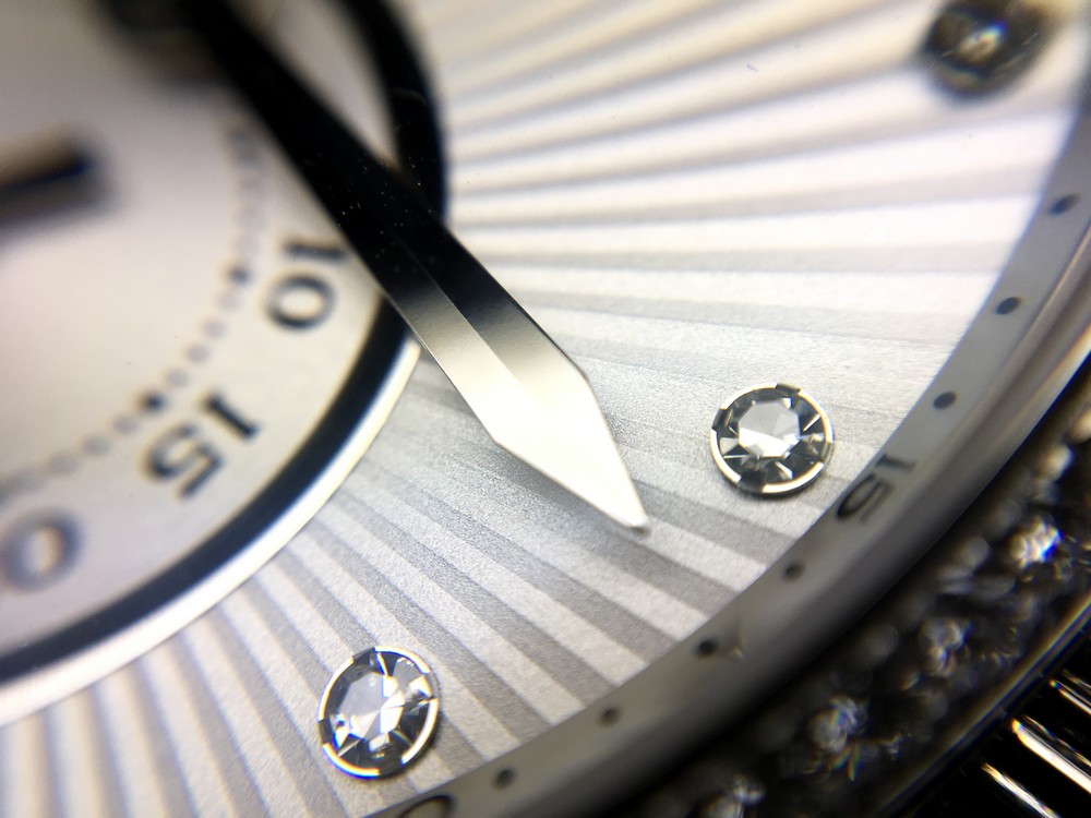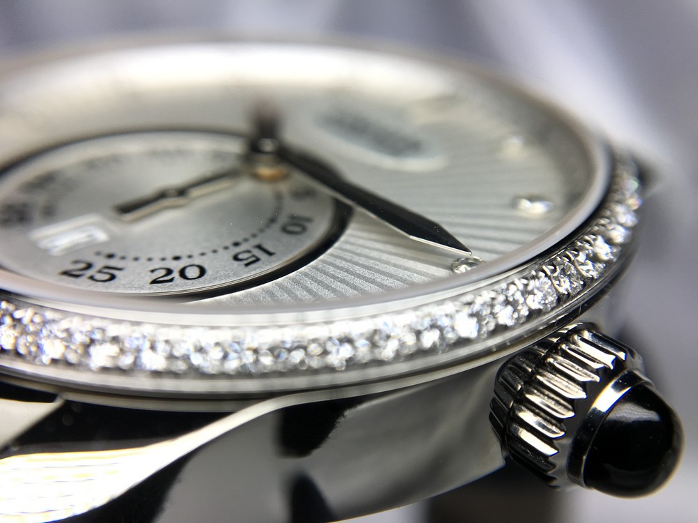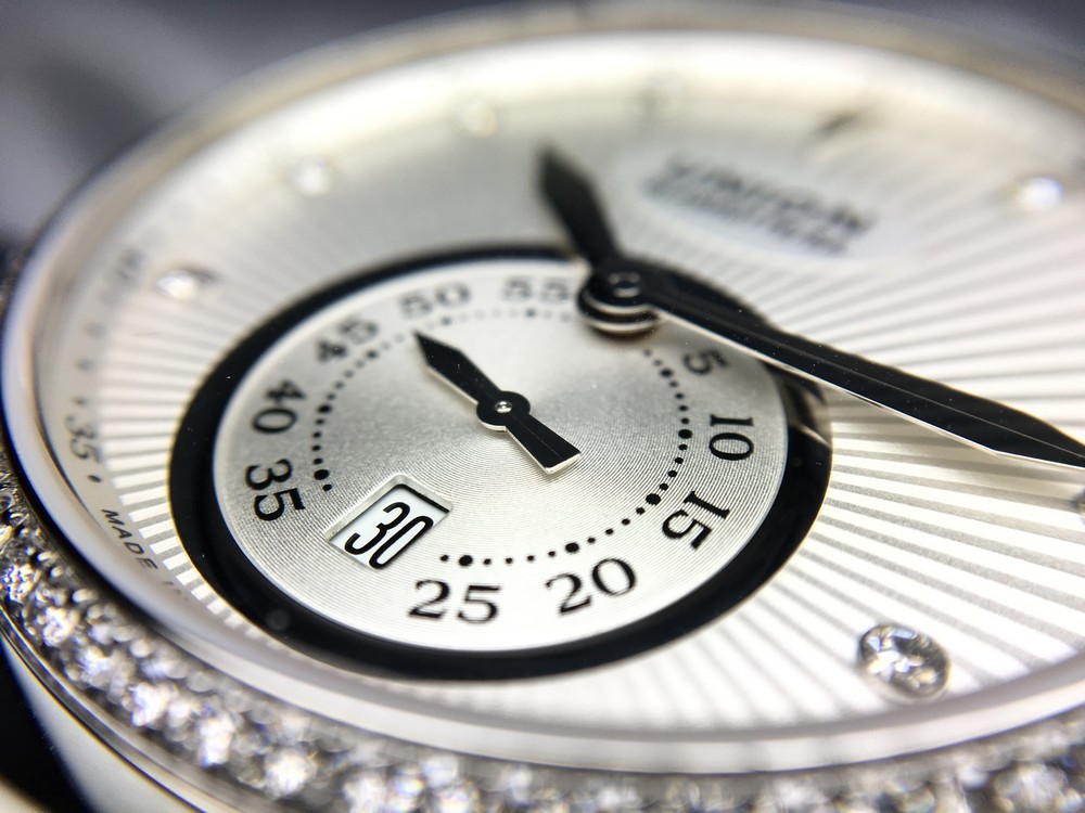 Seris Small Second - классическая женская модель, индикация часов и минут центральными стрелками, вынесенная малая секундная стрелка в положении 6 часов, индикация даты в положении 6 часов, корпус и циферблат украшены бриллиантами