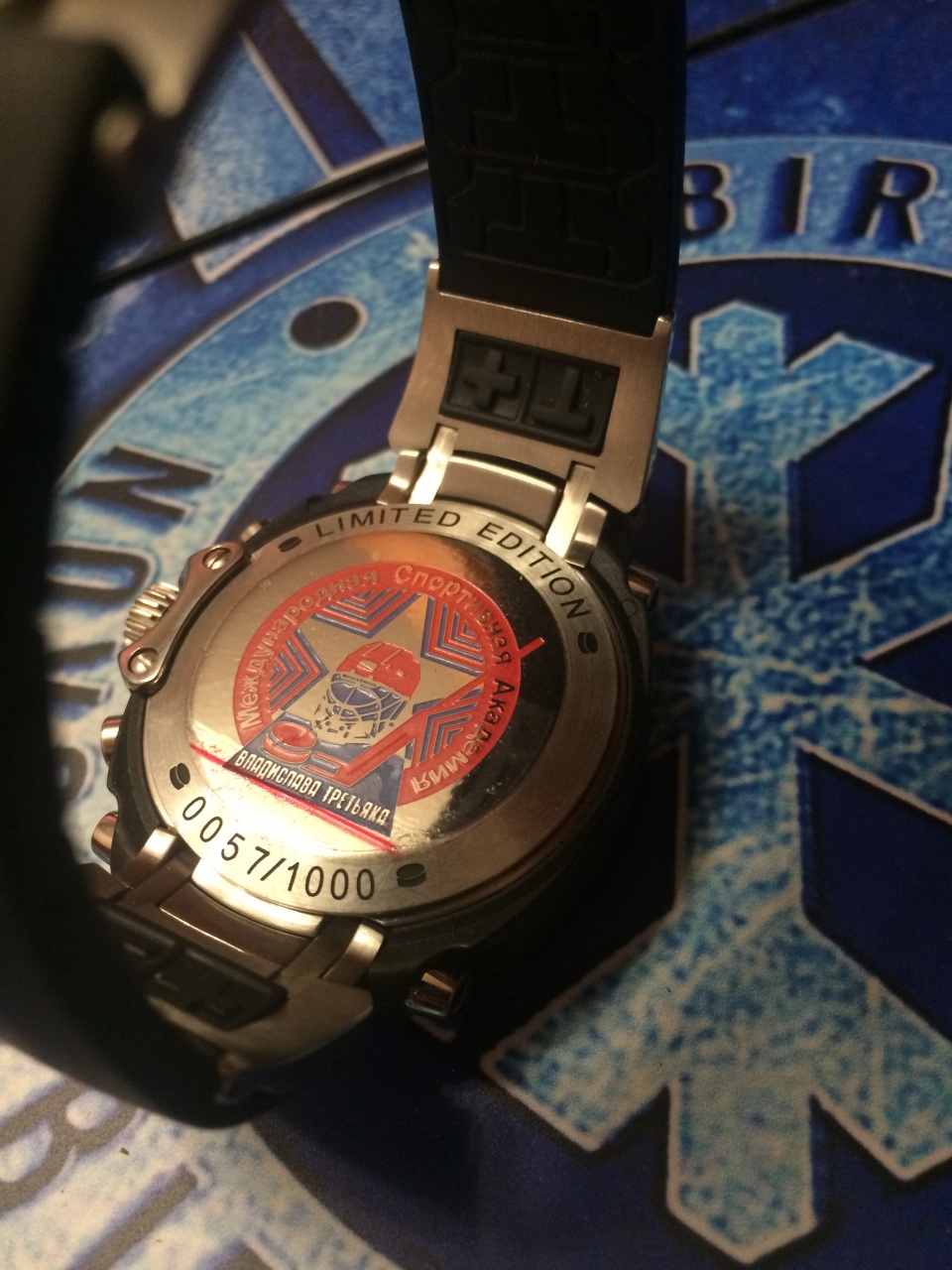 Кварцевый хронограф. Механизм ETA G15.211 (на 6 камнях). Секундная стрелка смещена на маленький циферблат (в 6 часов). Дополнительные циферблаты хронографа: на 30 минут и 1/10 доли секунд. Секундомер с режимами ADD и SPLIT. Окошко даты. Срок службы батареи 35 месяцев. • Сапфировое стекло устойчивое к царапанию. • Светонакопительный состав на стрелках. • Корпус из высококачественного стального сплава 316L с высокими антикоррозийными свойствами. • Корпус с карбоновым покрытием. • Водозащита до 10 АТМ. • Ремешок из натурального каучука. • Браслетный замок с тройным сгибом, расстегиваемый одним касанием. • Размеры корпуса 39,6 мм (по оси заводной головки, включая головку) х 39,5 мм (по вертикали). Толщина корпуса 11,85 мм. • Часы посвящены хоккею с шайбой, лимитированная серия.
