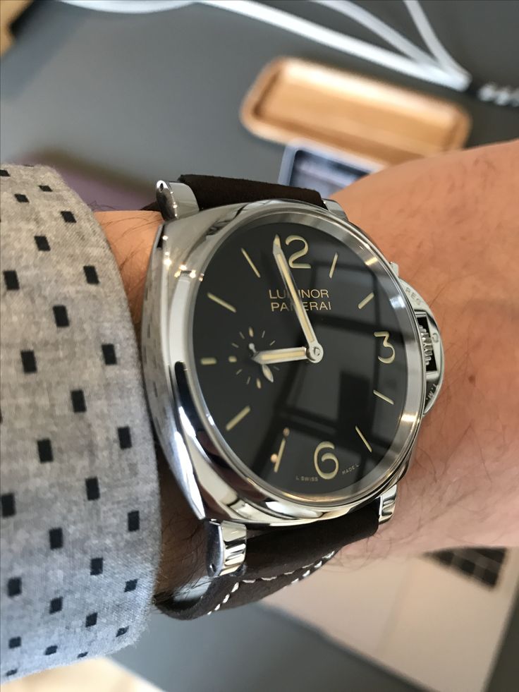 Но тут увидел новинку, кажется 2016 года, Пам 676!!! Вроде все, что хотел: и тебе 1950, и на ручке, и цифер интересный. Но 42мм (!) не маленький ли для Памов? Хотелось бы фото на руке увидеть. Ну и очищения в целом от часов.