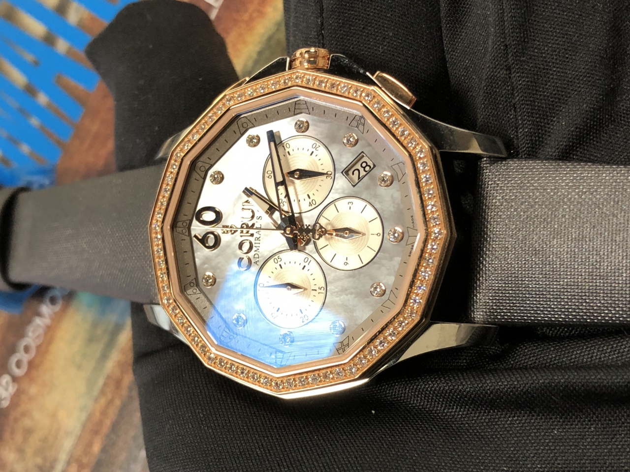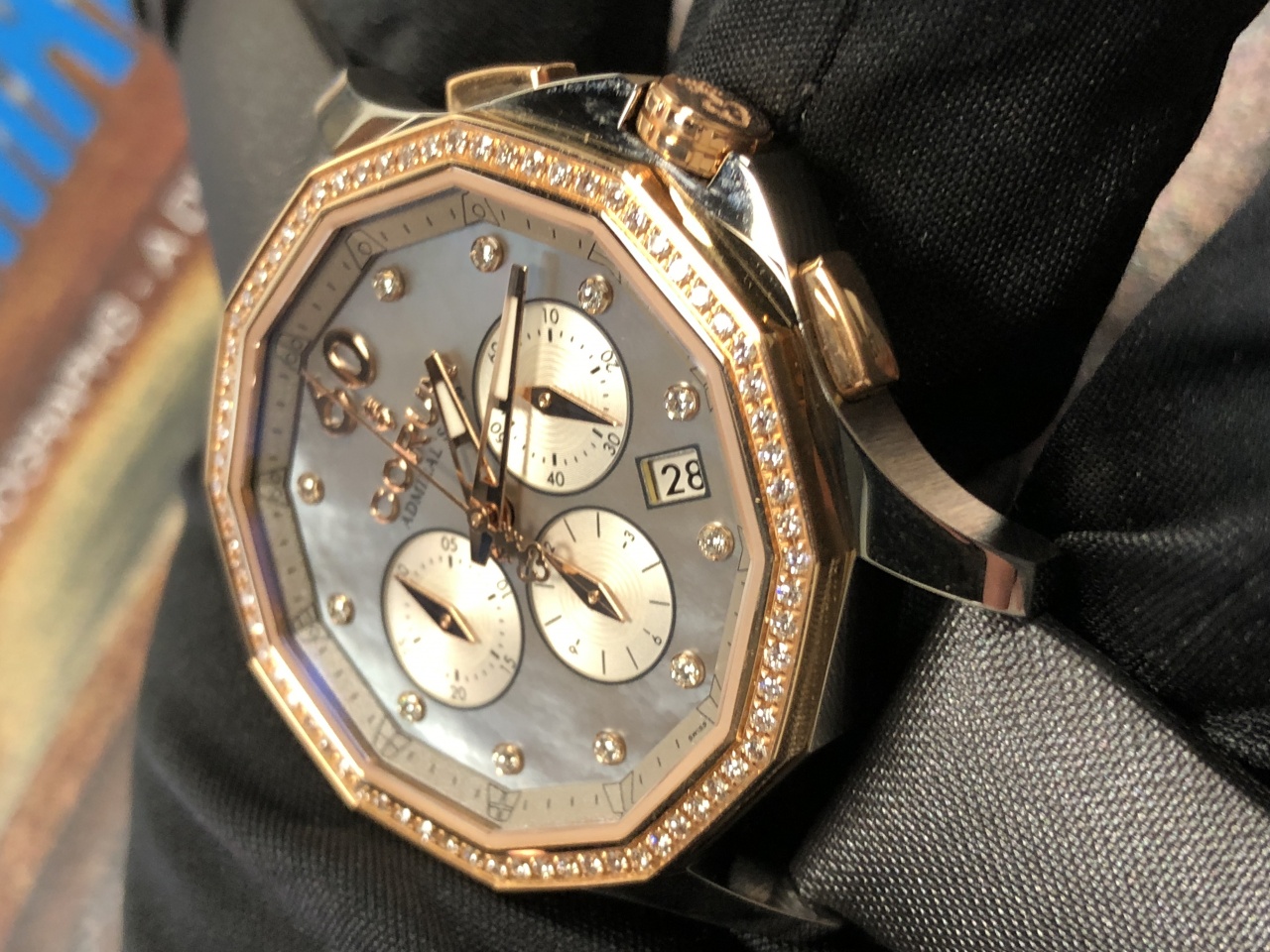 натуральный перламутр, золотые метки инкрустированы 11-ю белыми бриллиантами круглой огранки, золотые стрелки со светонакапливающим покрытием, накладные арабские цифры из розового золота, счетчики хронографа белые, с гильошированной отделкой, в положении "3 часов", "6 часов" и "9 часов", окошко индикации даты между "4 часами" и "5 часами"