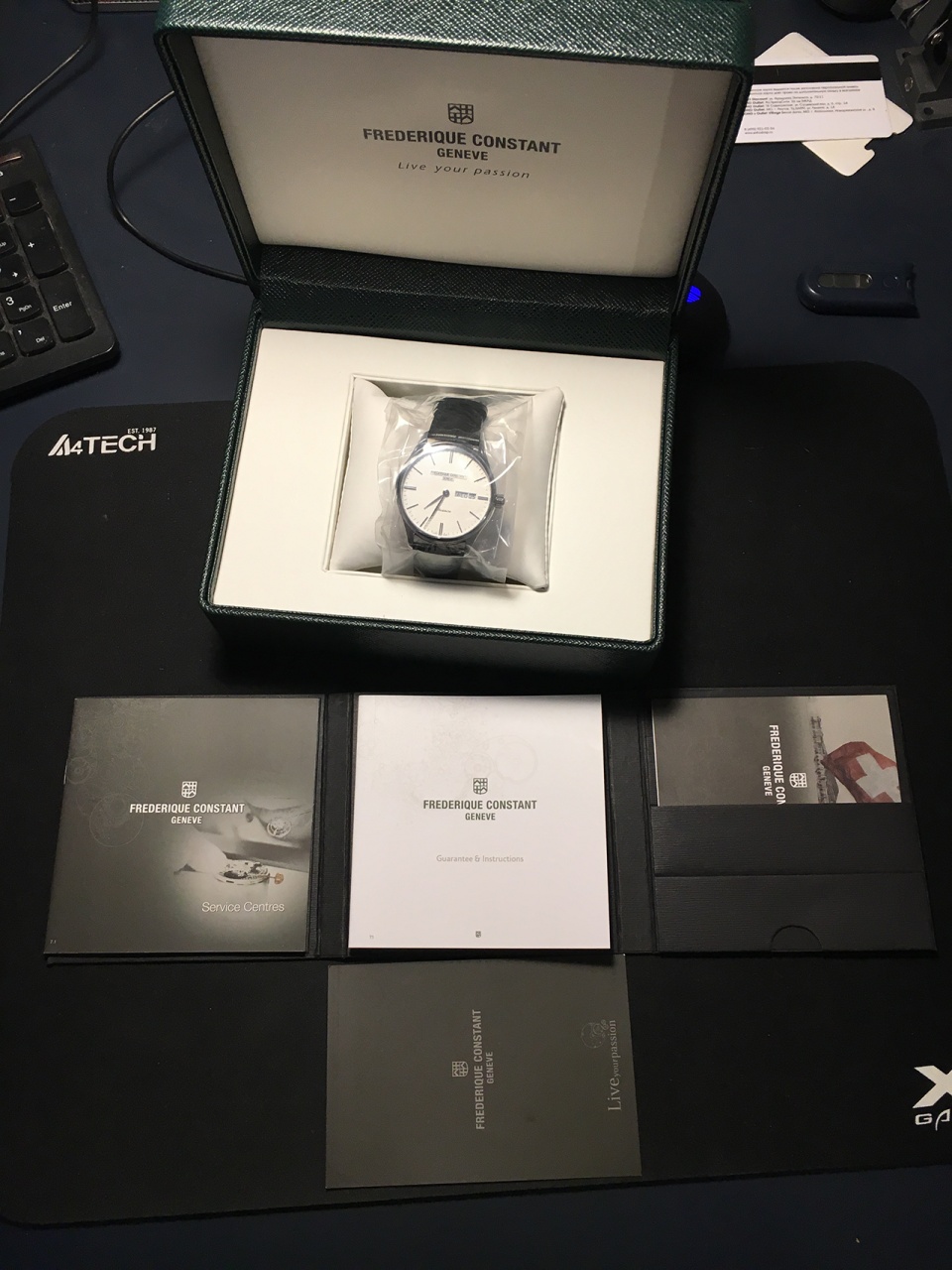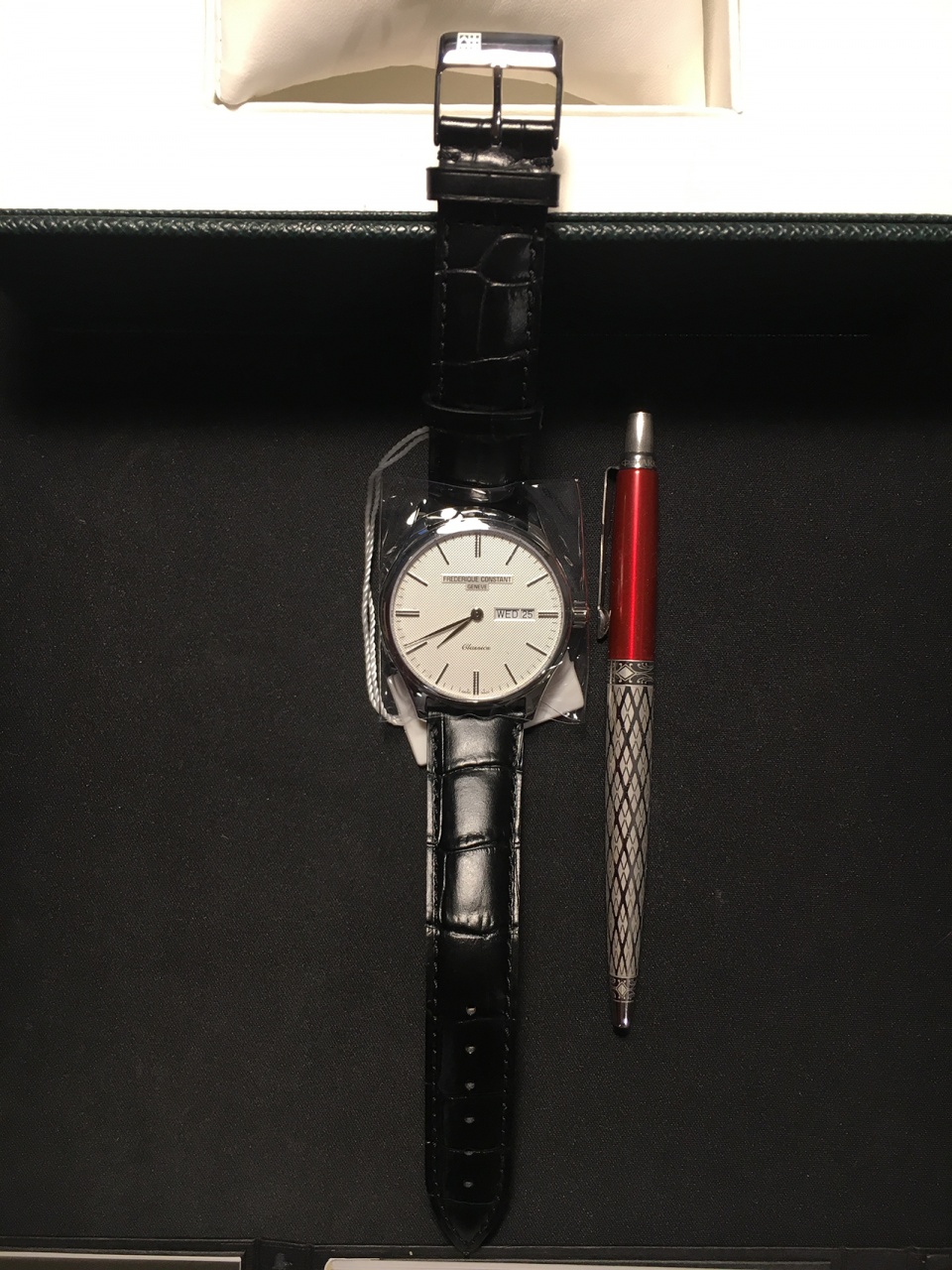Предлагаю вам классику во плоти. 40 миллиметровый Фредерик Констант с сапфировым стеклом и полезными усложнениями в виде окошка даты и дня недели. Чего не хватает в этих часах? Так это "предательской" секундной стрелки, что безусловно является плюсом в кварцевых часах!