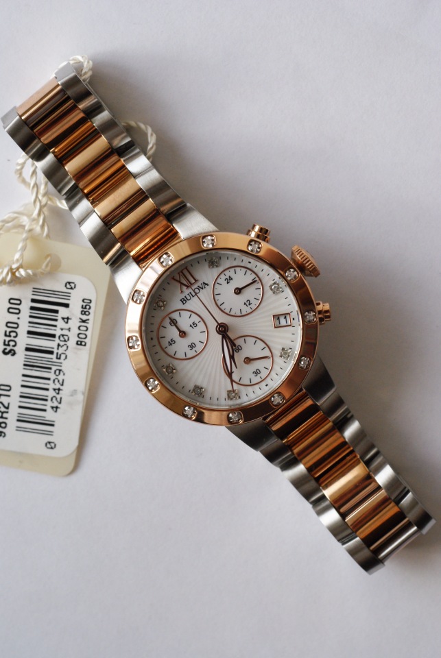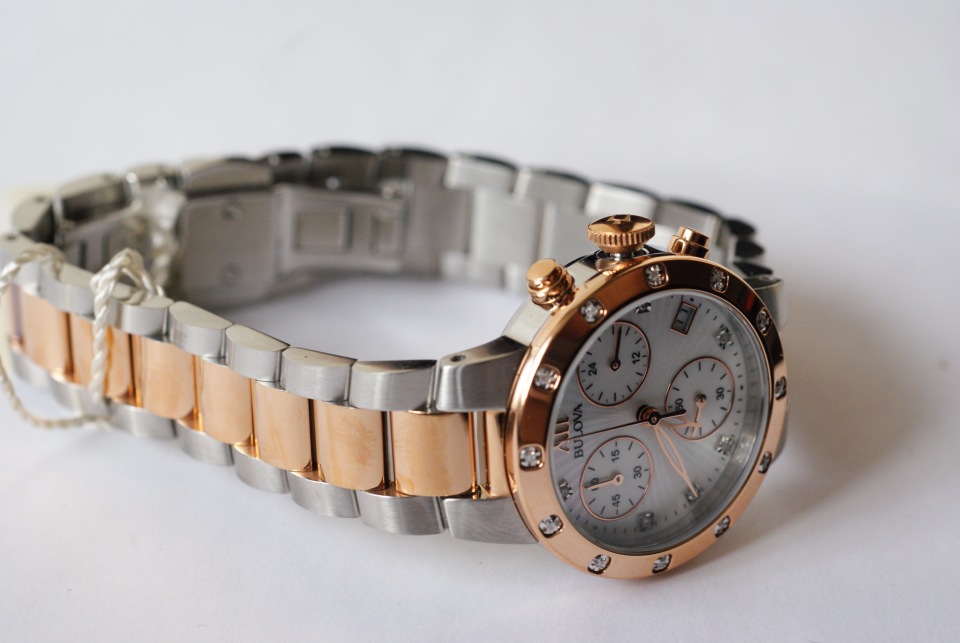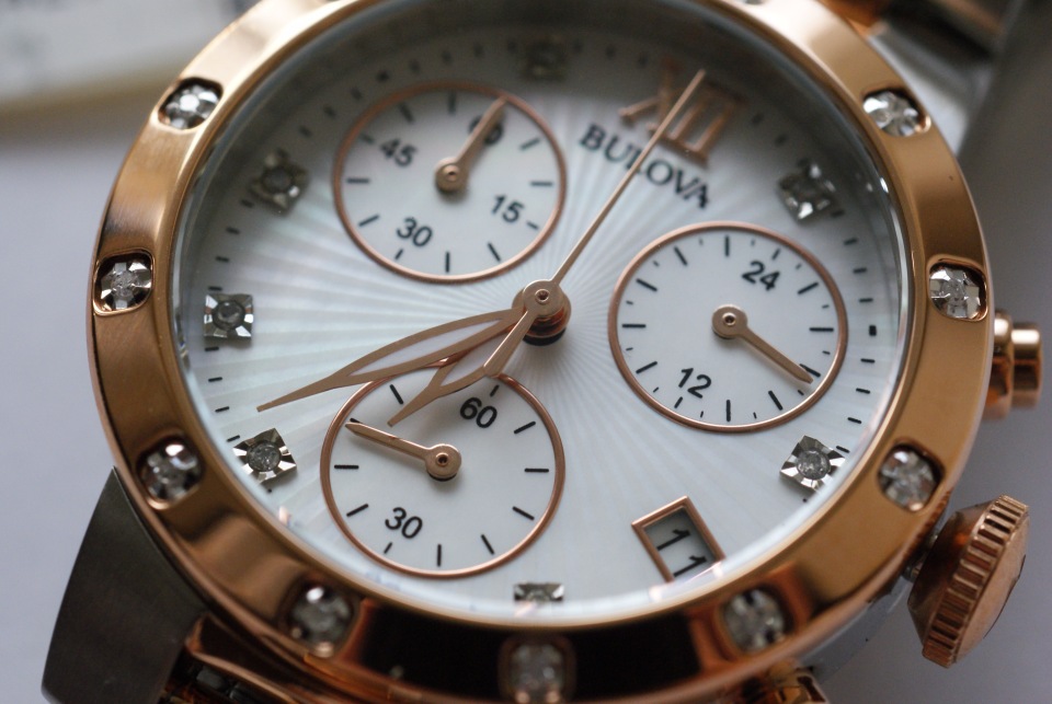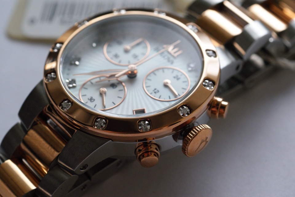 - Изумительный элегантный внешний вид. Фактурный цифер с тремя сабдиалами и окошком даты отлично сочетается с бриллиантовыми метками и камушками на безеле, выделяя хозяйку, дополняя любой образ и наряд и макияж.
