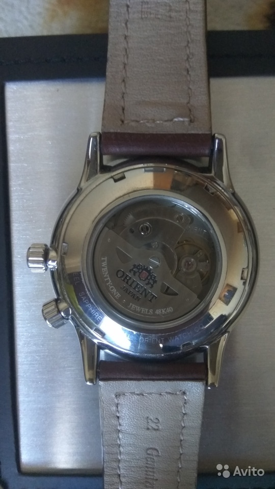 Отличные механические часы с автоподзаводом. Калибр 48K40, 21 рубин. Запас хода на 40 часов.Ретроградный указатель запаса хода. Двойное время. Сапфировое стекло с антибликовым покрытием. Противоударное устройство оси баланса. Черный циферблат с центральной секундной стрелкой и люминесцентными минутной, часовой стрелками и метками. Внутренний вращающийся безель с логарифмической линейкой. Индикация даты в позиции шести часов. Водонепроницаемость WR 50. Коричневый ремешок из натуральной кожи. Прозрачная задняя крышка. Точность хода +25/-15 секунд в сутки. Диаметр 44 мм, толщина 14 мм. В комплекте - коробка, инструкция, стальной браслет. Часы без потертостей и сколов!