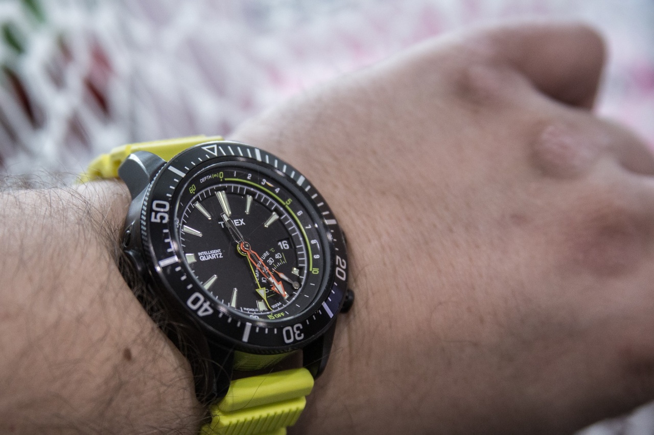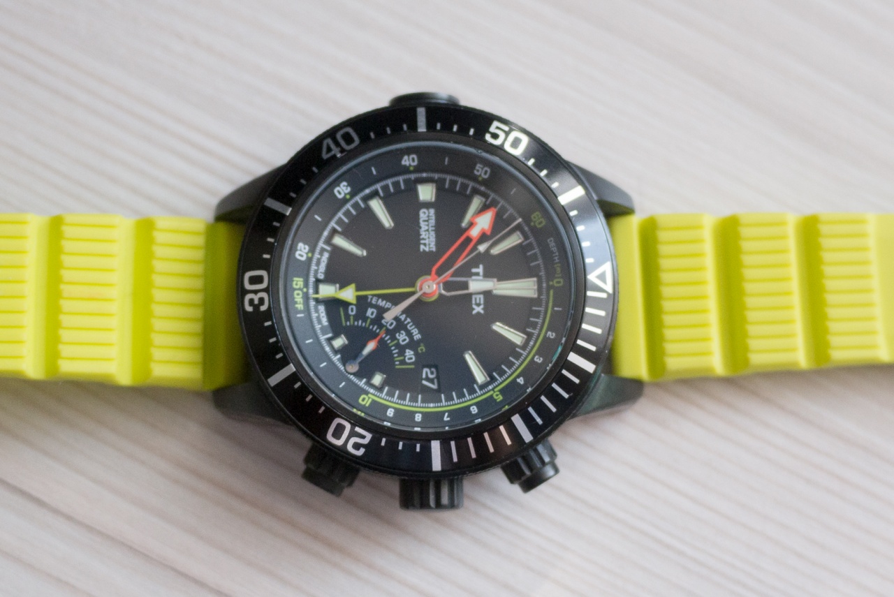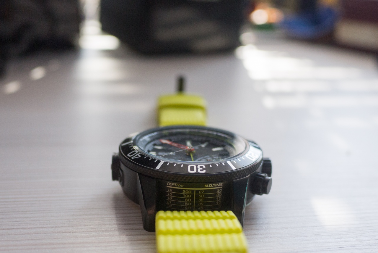 На борту есть глубиномер и датчик температуры, желтый каучуковый ремешок, минеральное стекло, окошко даты, черное PVD покрытие корпуса, дайверский вращающийся безель, люм на стрелках и метках, подсветка INDIGLO.