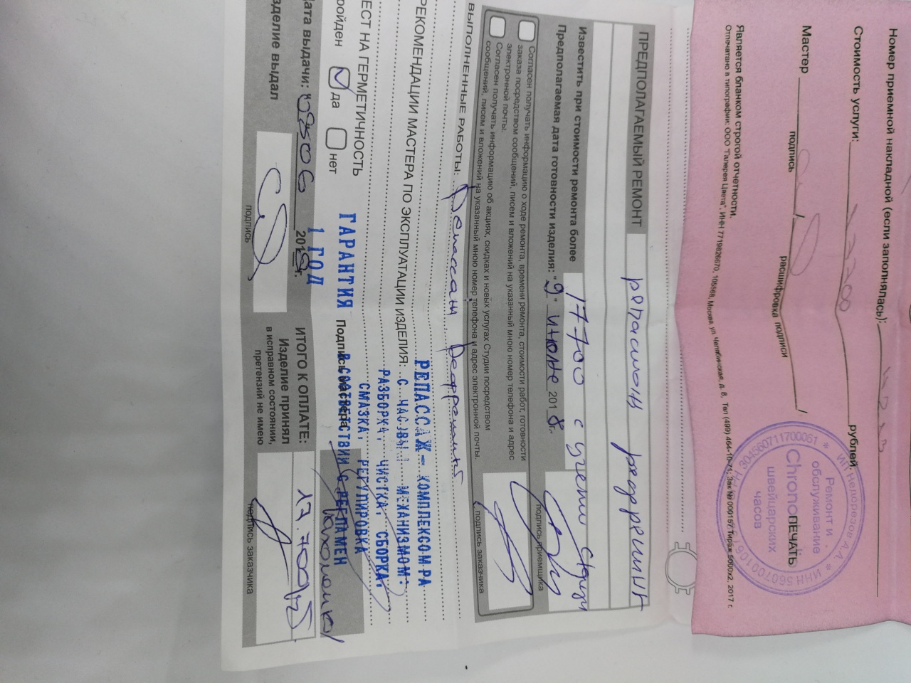 Часы после полного ТО (репассаж) и рефрешинга, с чеками из Хроностудио (Chronostudio) на 17.700₽ от 09.06.2018 года (Гарантия 1 год).