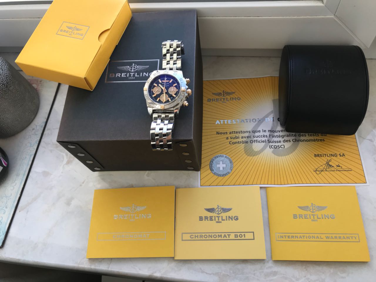 В продаже яркий представитель из флагманской линейки Брайтлинг. Часы в представлении не нуждаются. Топовая модель с мануфактурным механизмом и запасом хода 70 часов. Ритейл почти 10 000$. Корпус сталь с золотом. Часы в отличном состоянии, на полном комплекте со всеми документами. Год покупки 2013.