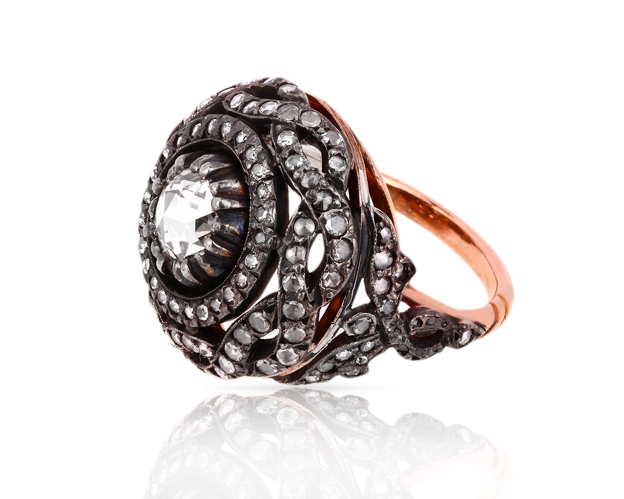 Представляем вашему вниманию старинное золотое кольцо с центральным бриллиантом 0.82ct и обсыпкой 0.90ct.