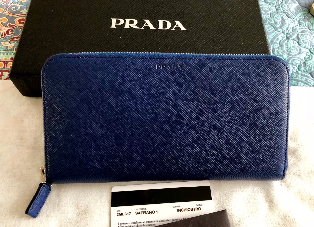 Легендарная кожа Saffiano, тисненый логотип, три больших продольных отделения, одно большое отделение на молнии, 12 слотов для кредитных карт, внутри отделка синим шелком и кожей. Размеры 10 см на 20 см, ширина 2 см. Легко влезает документы, права, паспорт, ПТС и тд. Красиво смотрится в руке или в деловом портфеле.