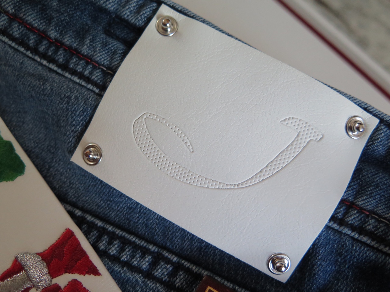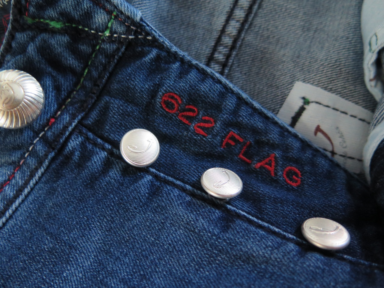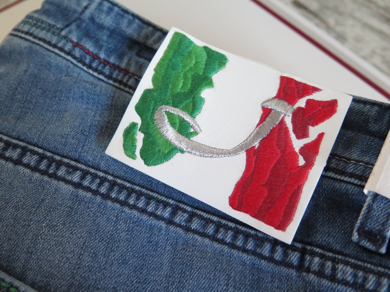 Сзади на правом бедре джинсы имеют ОТСТЁГИВАЮЩИЙСЯ (рекомендуется снимать перед стиркой) фирменный ярлык из кожи с вышитым цветными нитками итальянским флагом и буквой J, что указывает на принадлежность к "премиальной" линейке марки!!!