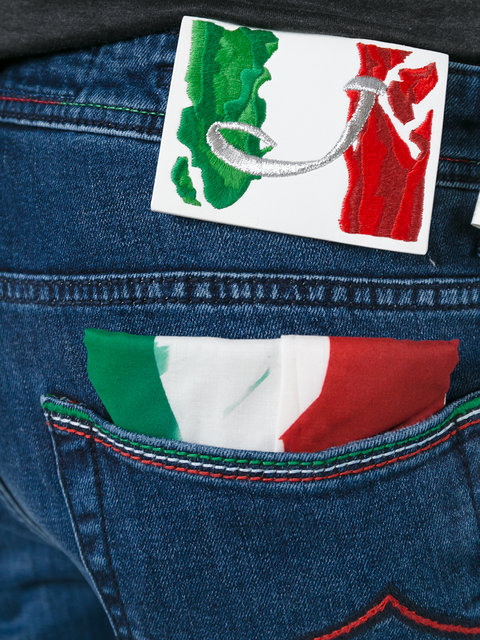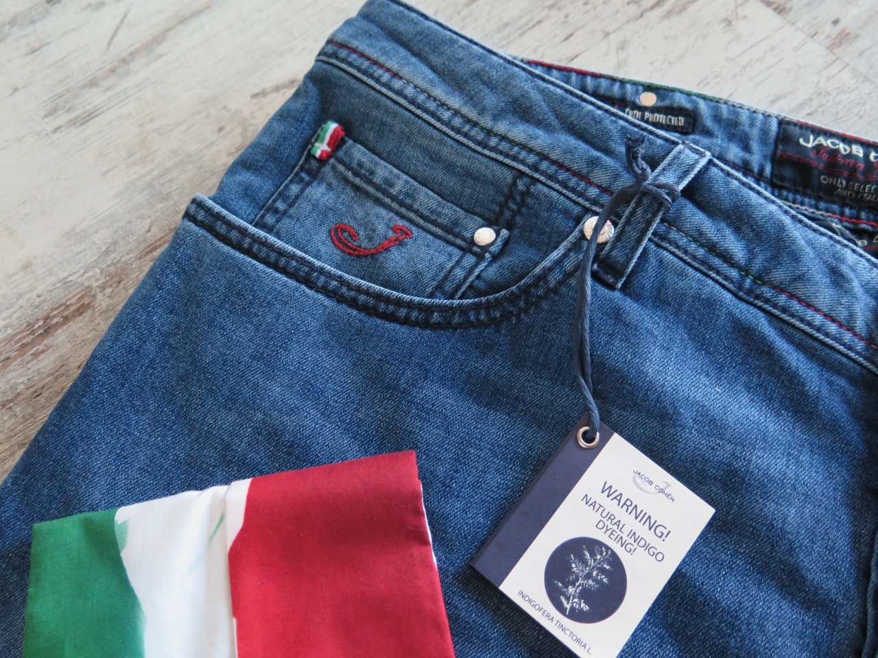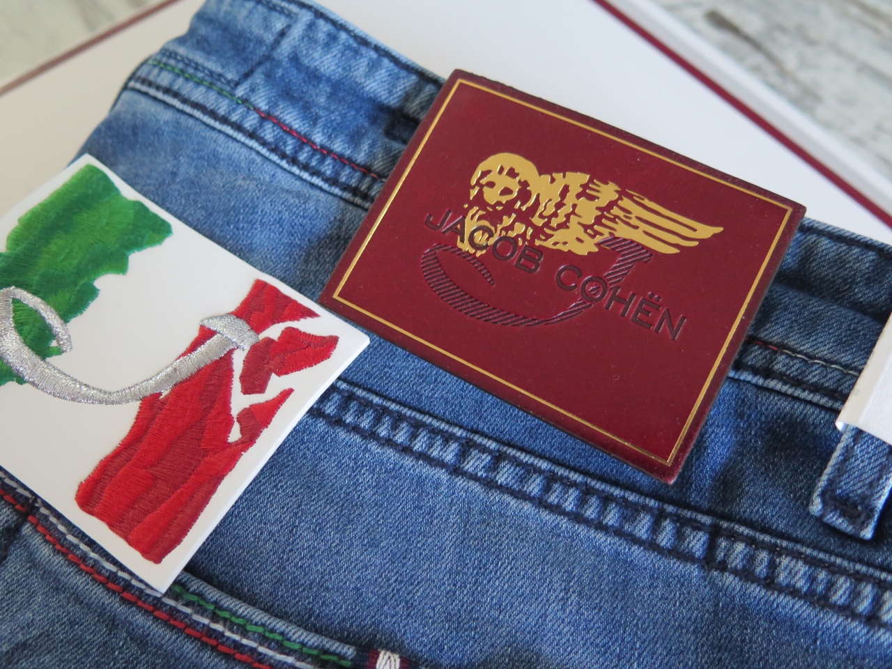 Сзади на правом бедре джинсы имеют ОТСТЁГИВАЮЩИЙСЯ (рекомендуется снимать перед стиркой) фирменный ярлык из кожи с вышитым цветными нитками итальянским флагом и буквой J, что указывает на принадлежность к "премиальной" линейке марки!!!