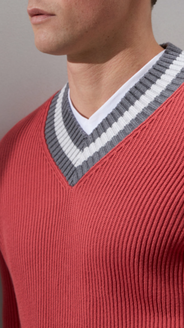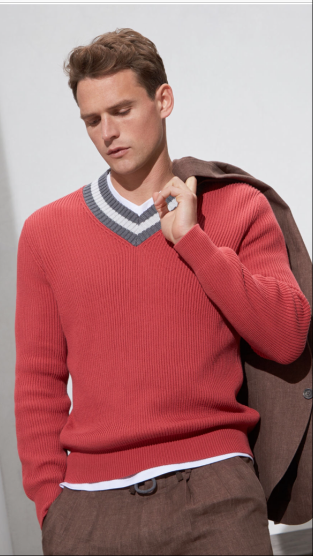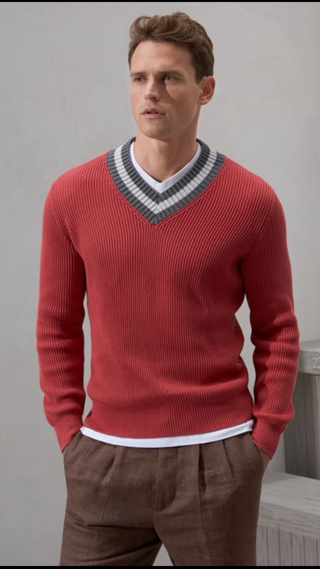 В продаже,новый мужской пуловер Golf Stripes из газового хлопка, выполненный английской резинкой от известной итальянской марки BRUNELLO CUCINELLI.Специальный газовый хлопок получают в результате трикотажной вязки со слегка уширенным звеном, которое придает всему изделию большую легкость и комфорт. Пуловер Golf Stripes с клинообразным вырезом обогащен необычными широкими полосами контрастного цвета. Яркие и энергичные цвета — одни из самых насыщенных в коллекции!!!!