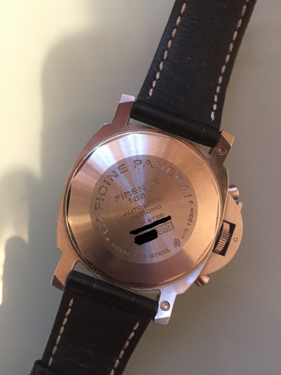 Корпус из нержавеющей стали, механизм Panerai OP XII (27 камней, Glucydur® баланс - 28 800 полуколебаний/час, Incabloc® противоударная система), часы, минуты, секунды, секундомер, люминесцентные стрелки и метки, диаметр 40 мм, толщина 17мм, запас хода 46 часов, кожаный ремешок, сертифицированный хронометр COSC. Носились редко.