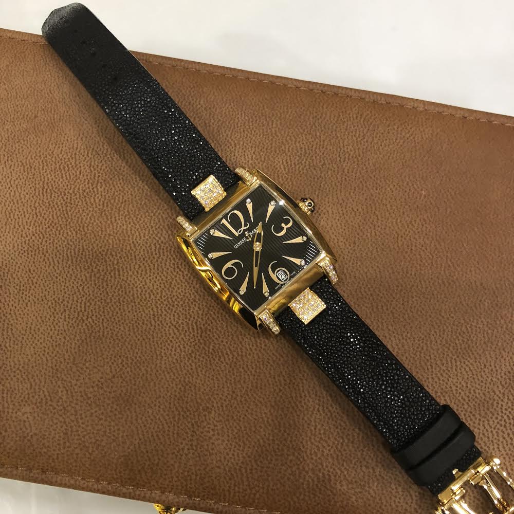 Чёрный циферблат часов Ulysse Nardin Caprice ref. 136-91 выполнен при помощи сложной ручной техники - гильоше - нанесение на поверхность тонкого гравированного узора из волнообразных, параллельных либо пересекающихся штрихов в правильной геометрической последовательности, кроме того циферблат дополнен арабскими цифрами и 8 бриллиантами. Центральная часовая и минутная стрелки покрыты люминесцентным составом для лучшей видимости в вечернее время. Окошко даты находится в положении на 6 часов. Автоматический калибр UN-13 обладает запасом хода в 42 часа при полном заводе. Часы водонепроницаемы на глубине до 50 метров.