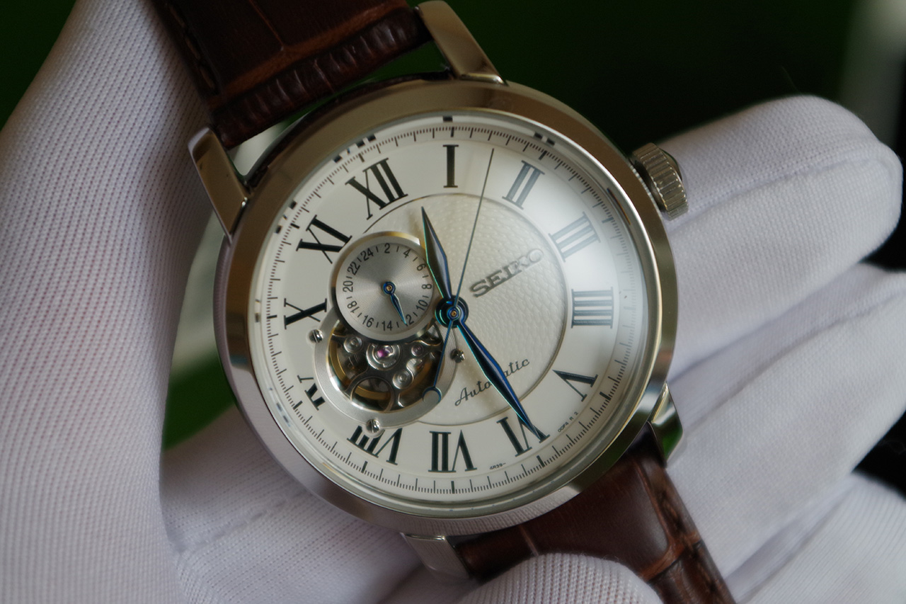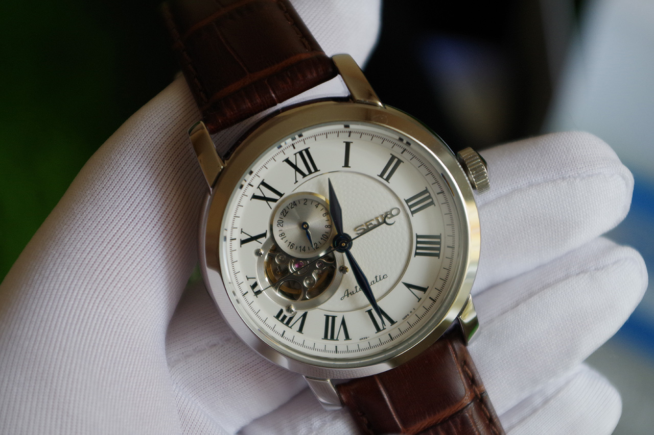 Presage. В механизме 24 камня, частота 21600 полуколебаний в час. Запас хода 41 час. Возможность ручного завода. 12-ти и 24-х часовой формат времени. Сквозь прозрачное окошко на циферблате можно наблюдать за работой механизма часов. Прозрачная задняя крышка.