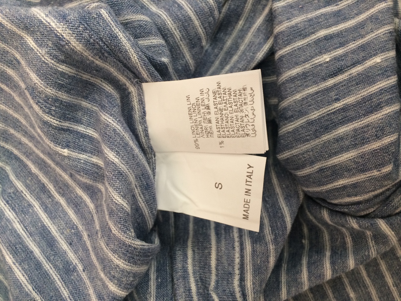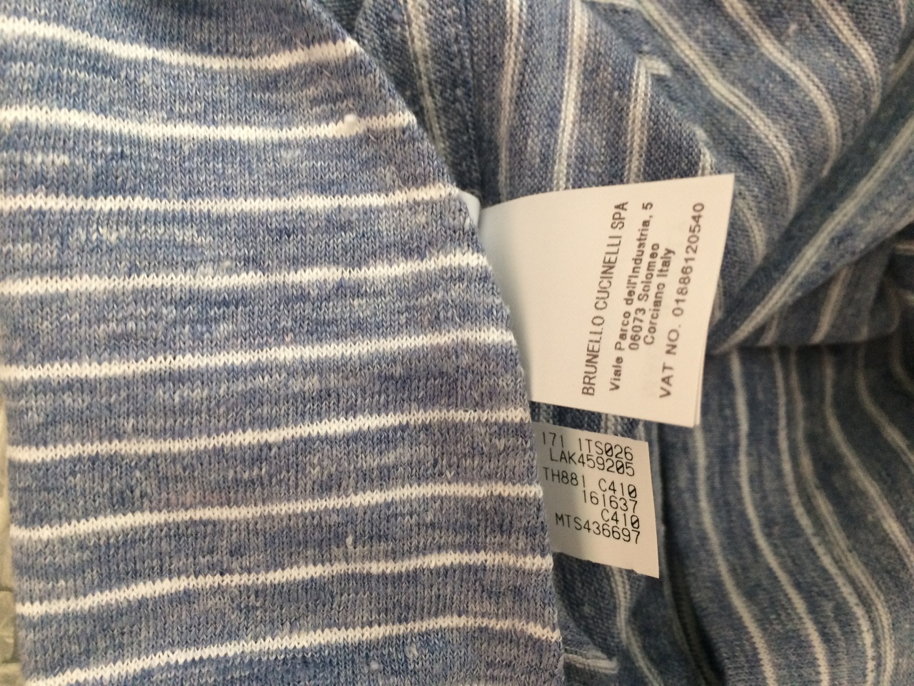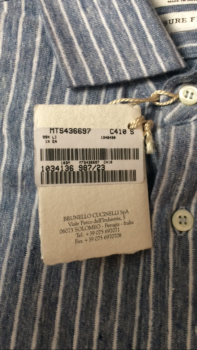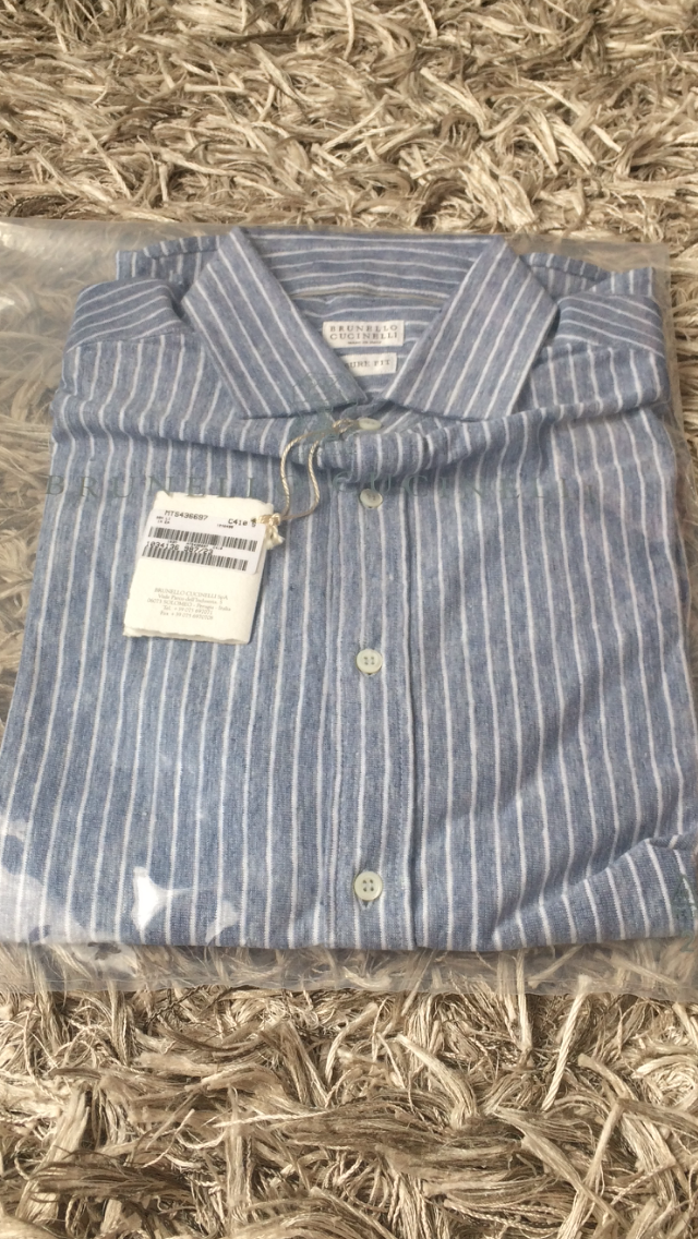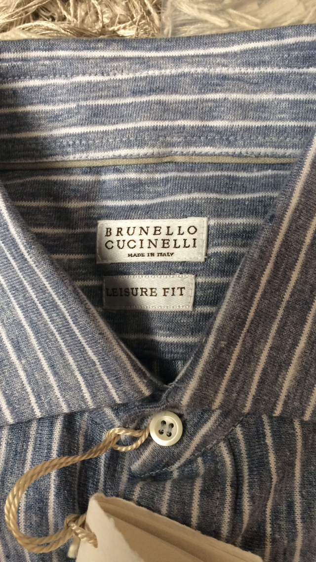 В продаже,новая мужская рубашка свободного кроя Leisure из эластичного льна в полоску от известной итальянской марки Brunello Cucinelli.Модель с характерной узловатостью натуральных волокон,которая придаёт поверхности слегка неравномерный вид,подчёркивающий неформальный стиль.Лёгкая рубашка из льняного джерси характеризуется короткими рукавами и отложным воротом на пуговицах.