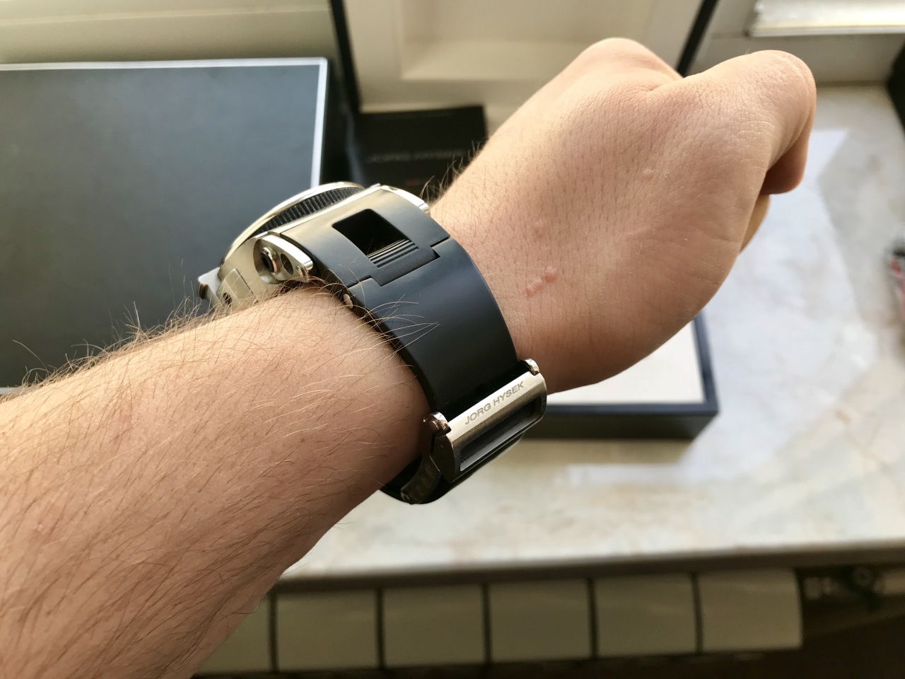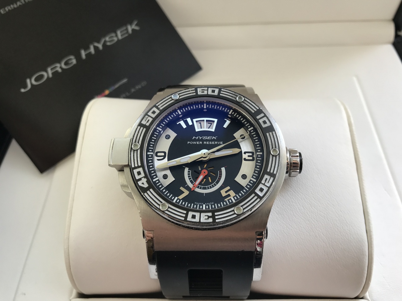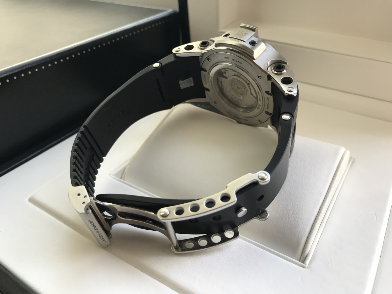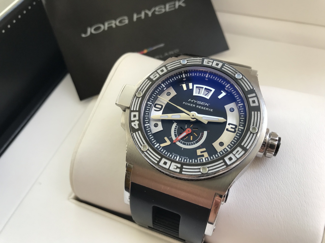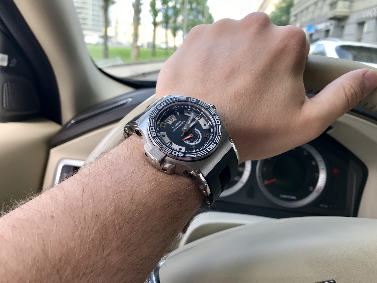 Заявленный диаметр 44мм, но выглядят крупнее. Массивные и толстые часы. Фото сделаны на средней руке, 18см. Индикация запаса хода и большой указатель даты идеально дополняют картину. Стоимость новых подобных на официальном сайте почти 15 000$!