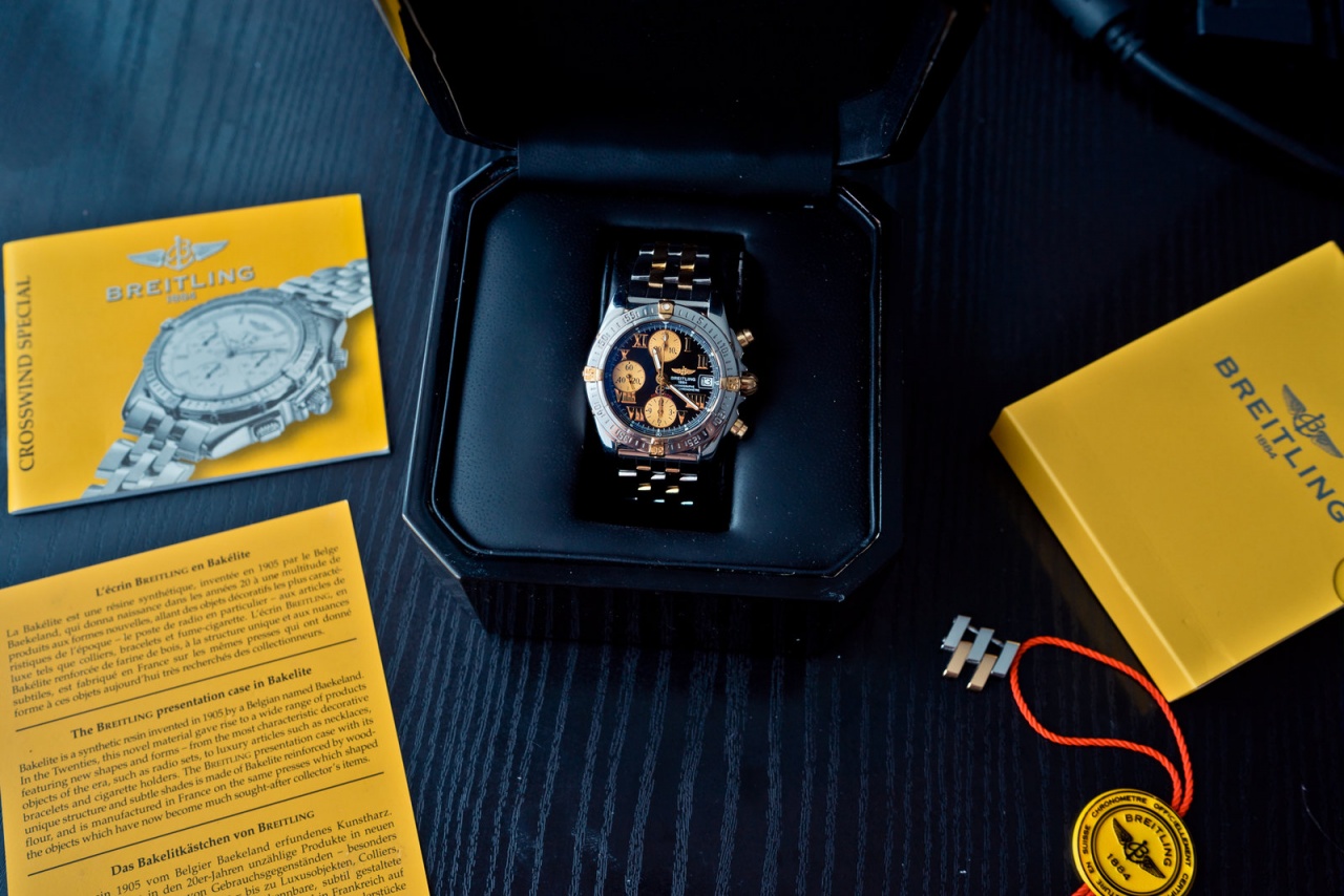 Комплект: часы, дополнительное звено (полный браслет!), коробка, бумажки, эмблема Breitling, сертификат C.O.S.C.