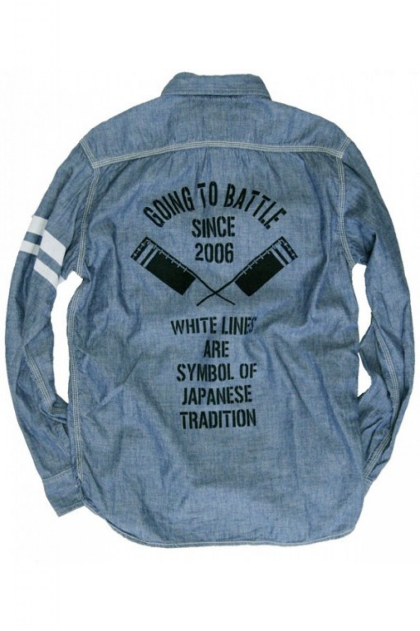 Рубашка шамбре от японского бренда Momotaro.MOMOTARO JEANS SJ091P CHAMBRAY PRINT WORK SHIRTS. Материал 5 унцевый шамбре из зимбабвийского хлопка. Селведж кромка, тройная отстрочка швов. Оставленные не обрезанные нити от тройной отстрочки швов цепным стежком - в дань традициям. На спине принт - "Going to Battle" . Рубашка абсолютно новая с тегами (не подошел размер). Размер производителя 42 - наш L. Цена ритейла 145$ , моя цена 6000р. Исключительное японское качество. Вещь будет долго радовать хозяина и со временем становиться только лучше !