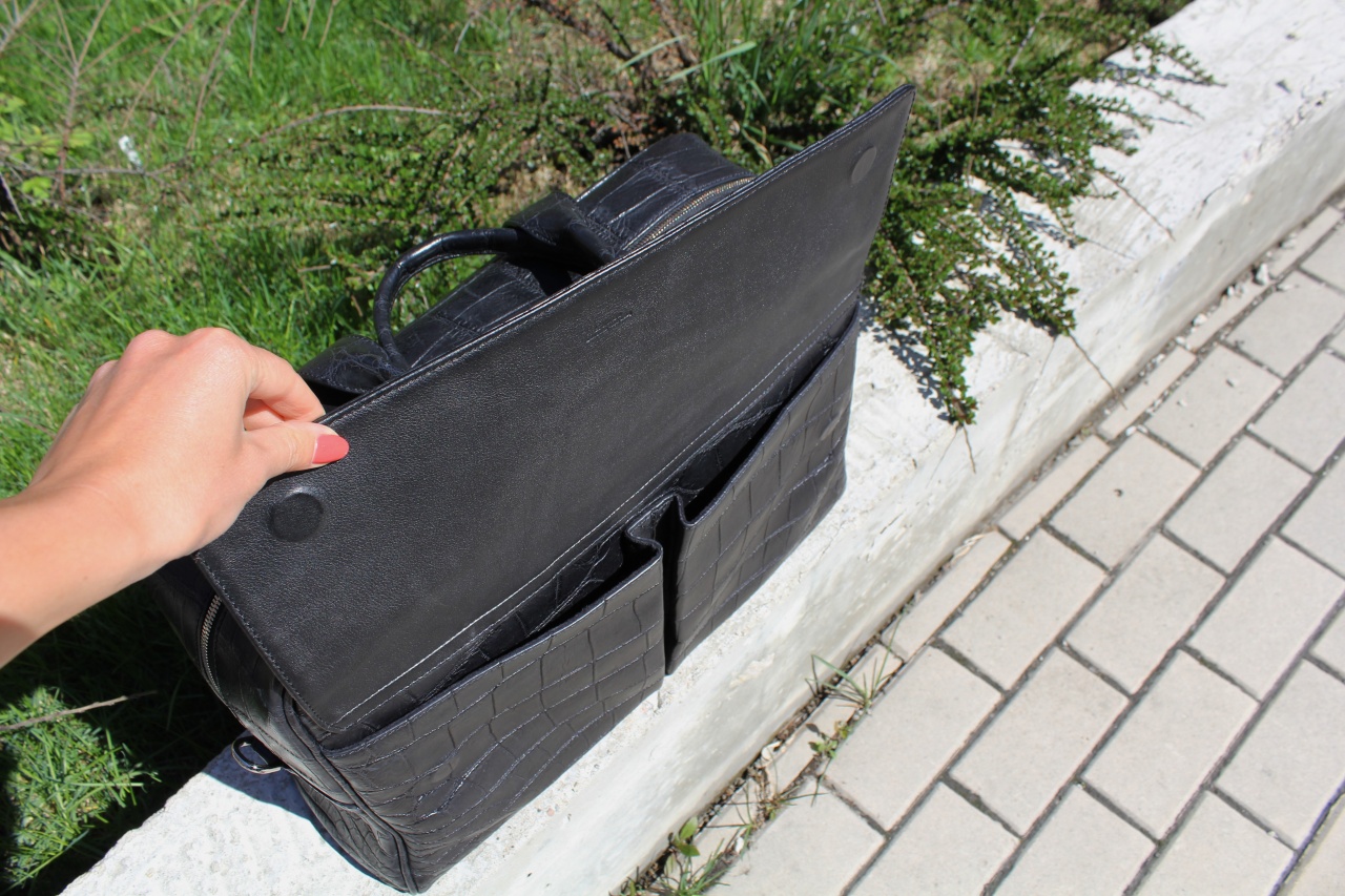 Сумка изготовлена из 100% кожи нильского крокодила высочайшего качества выделки с матовой поверхностью, окрашенной вручную в чёрный цвет.