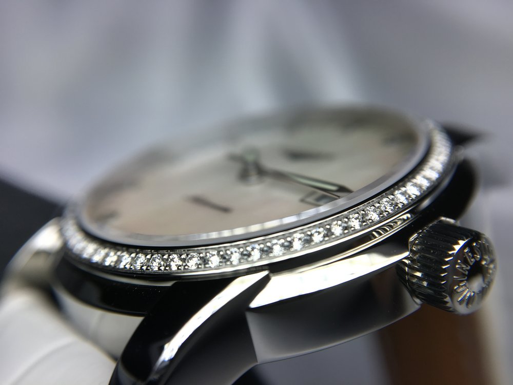 Корпус и перламутровый циферблат украшен бриллиантами: