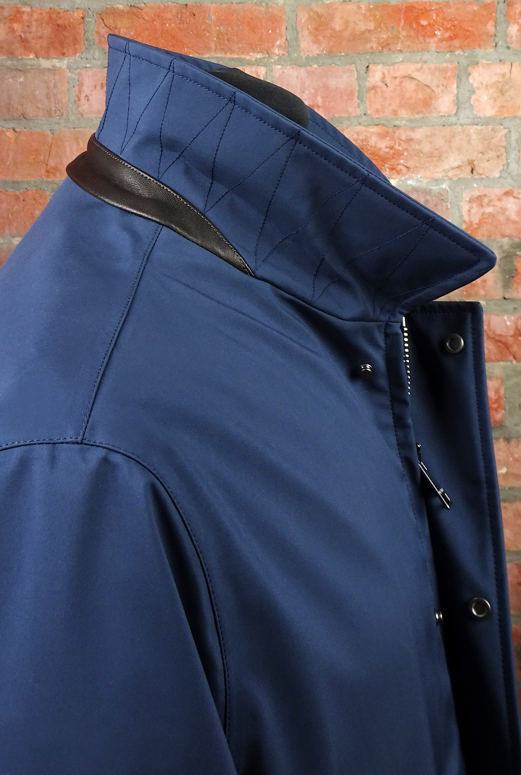 При этом внешне смотрится очень элегантно, фасон в стиле Kiton. Воротник поднимается, с внешней стороны оторочен кожей и прострочен зигзагом.