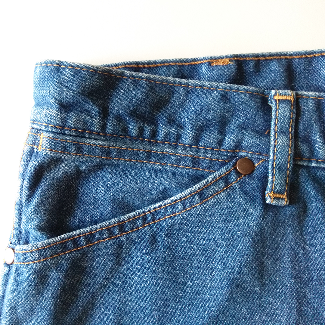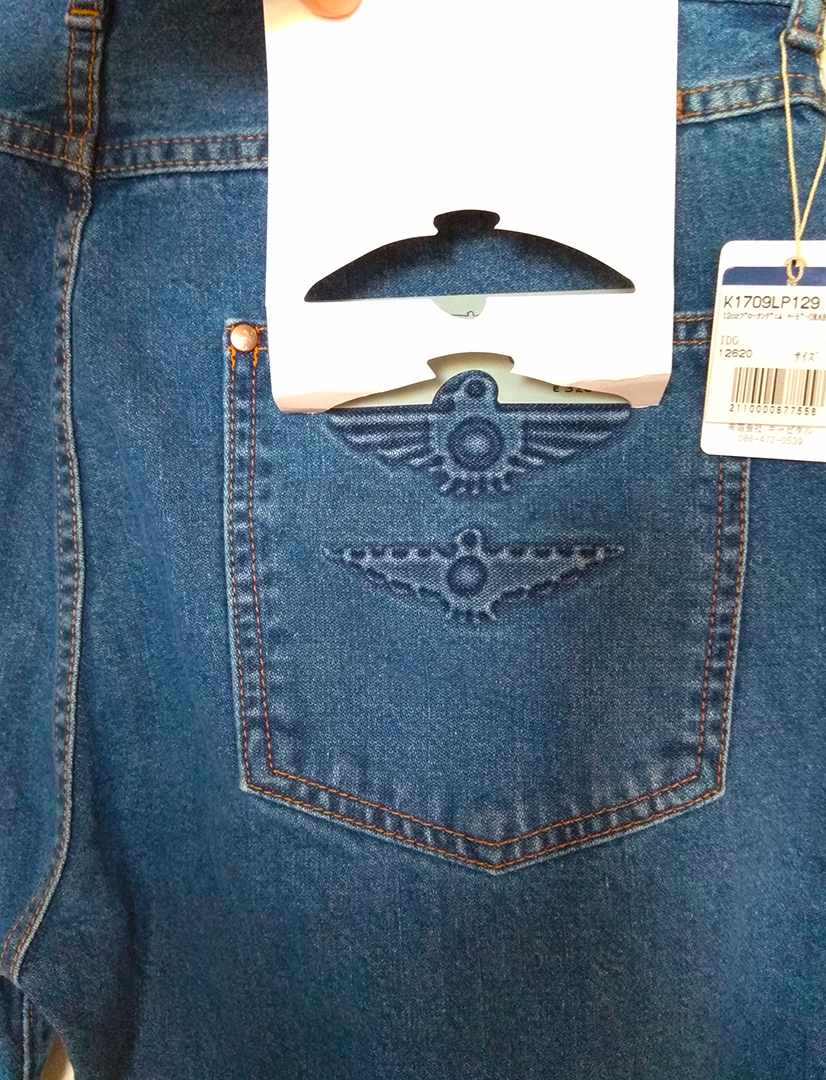 Высокая талия, слим. Очень равномерный винтажный голубой вариант воша. Плотность 12 oz, мягкий broken twill. На заднем кармане тиснение птиц. Пятый карман сделан очень широким — во всю ширину основного, но меньшей глубины.