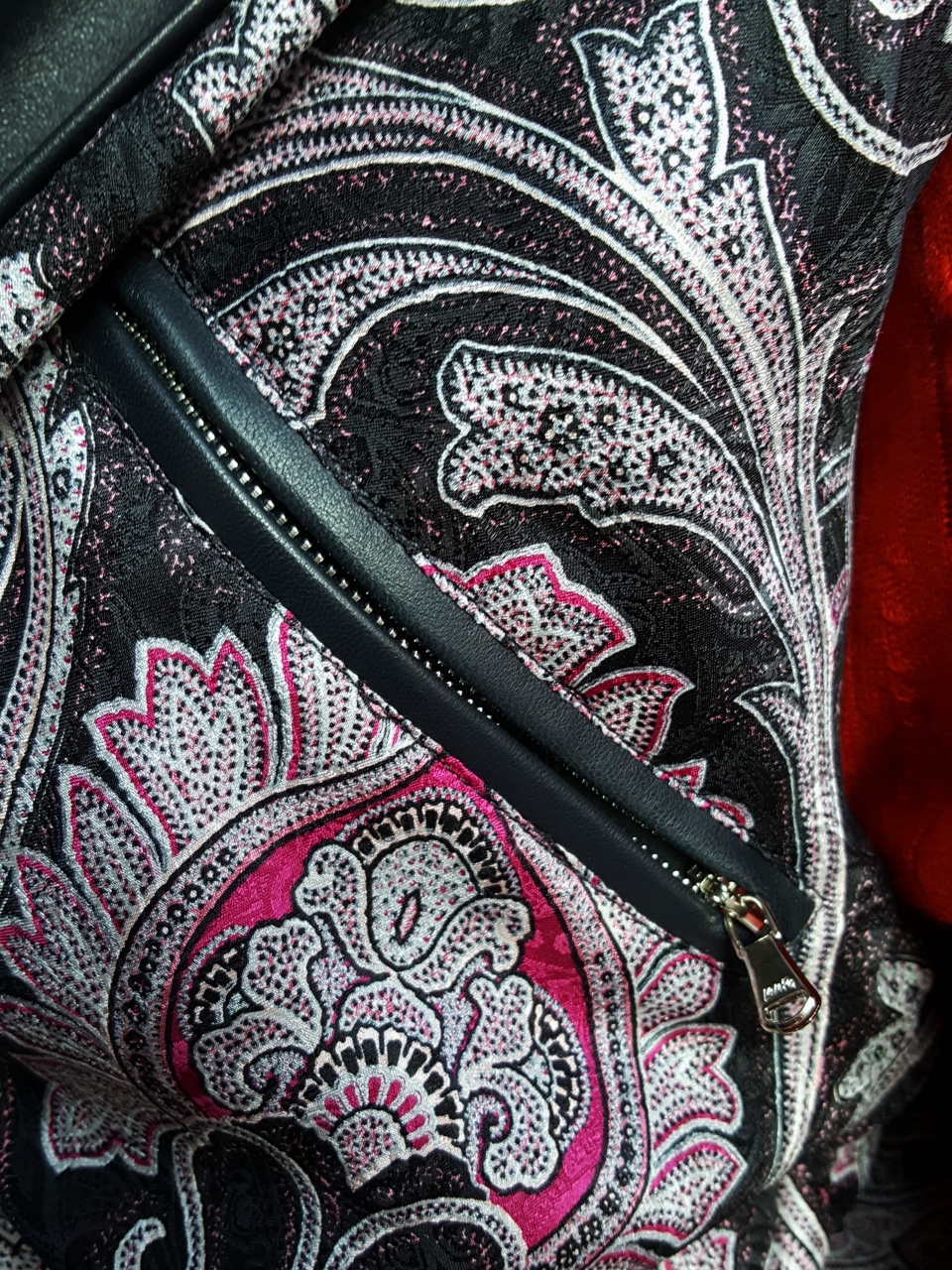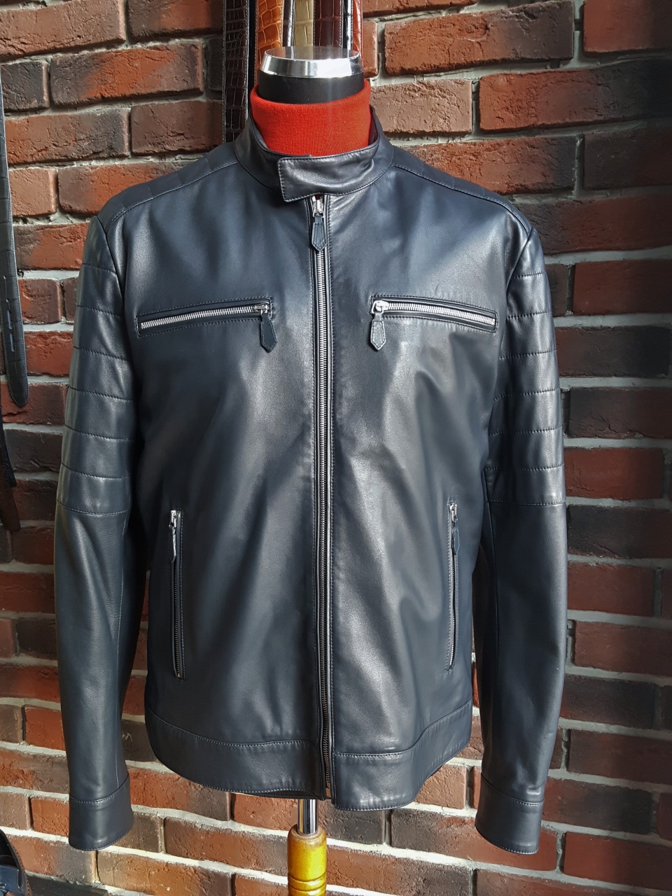 Куртка застегивается на молнию с бегунком из кожи и имеет два нагрудных кармана, застёгивающиеся на молнию, два боковых кармана прорезных кармана, застёгивающиеся на молнию.