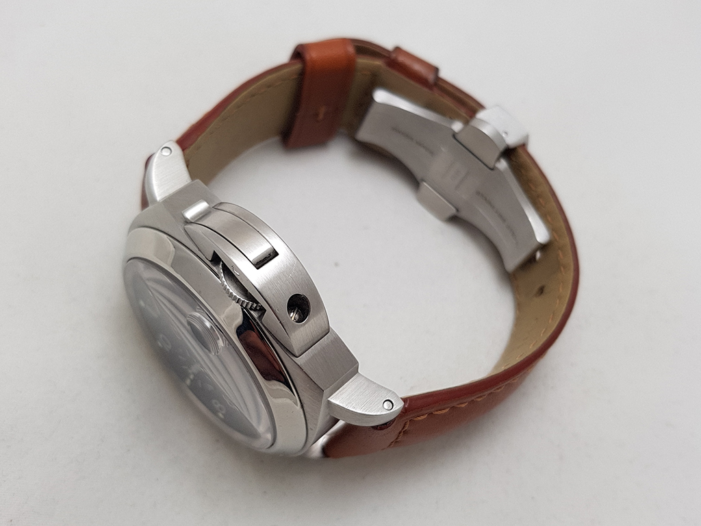 - Корпус из сатинированной стали, диаметр без ЗГ 44 мм