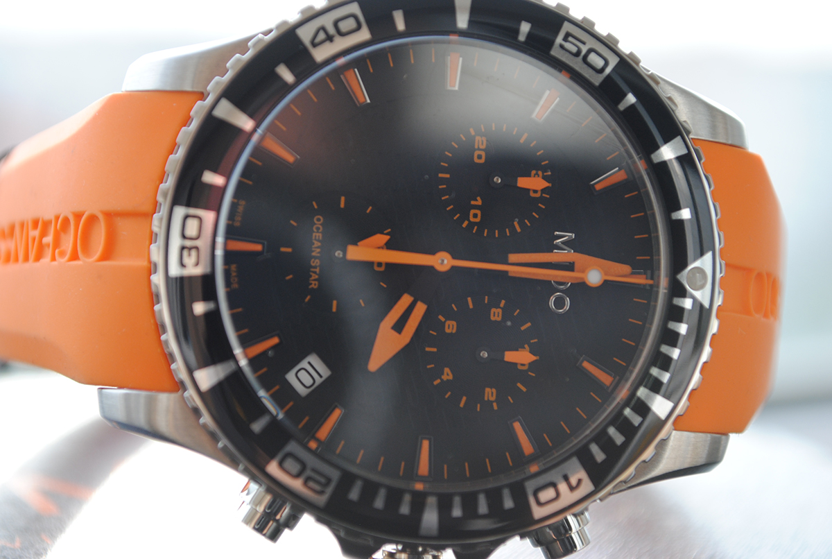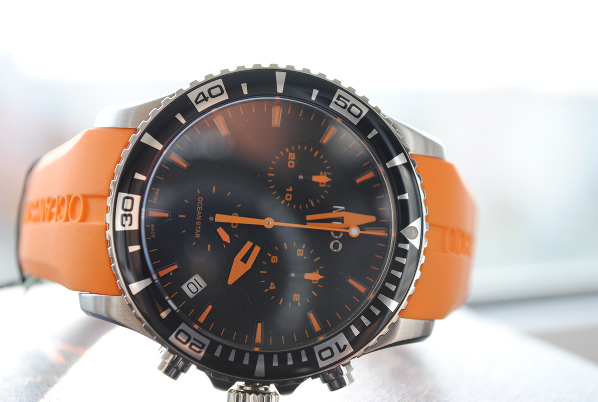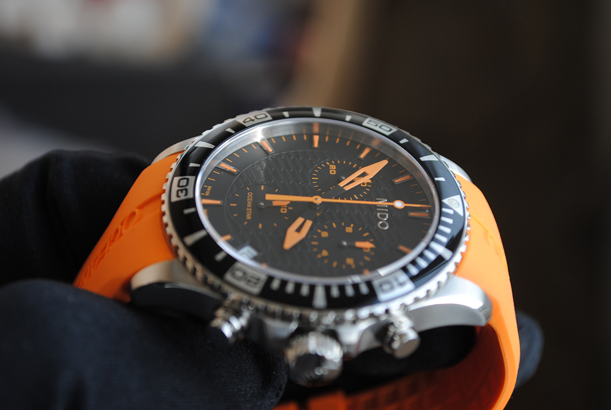 ЧЁРНО-ОРАНЖЕВЫЙ, ВЕСЕЛЫЙ MIDO OCEAN STAR Chronograph//кварц//WR200//оранжевый каучук//