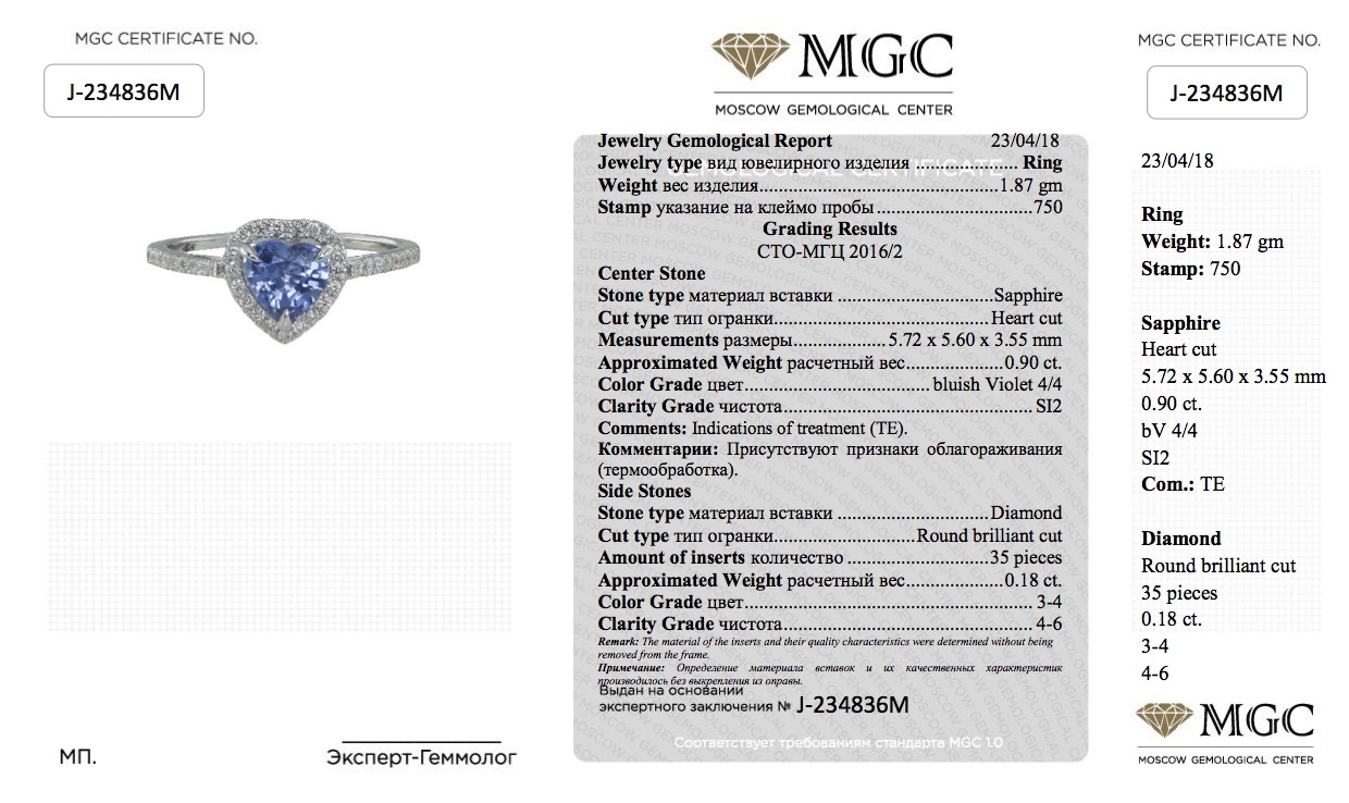 Кольцо из белого золота с сапфиром 0,90 карат и бриллиантами 0,18 карат (сертификат МГЦ)