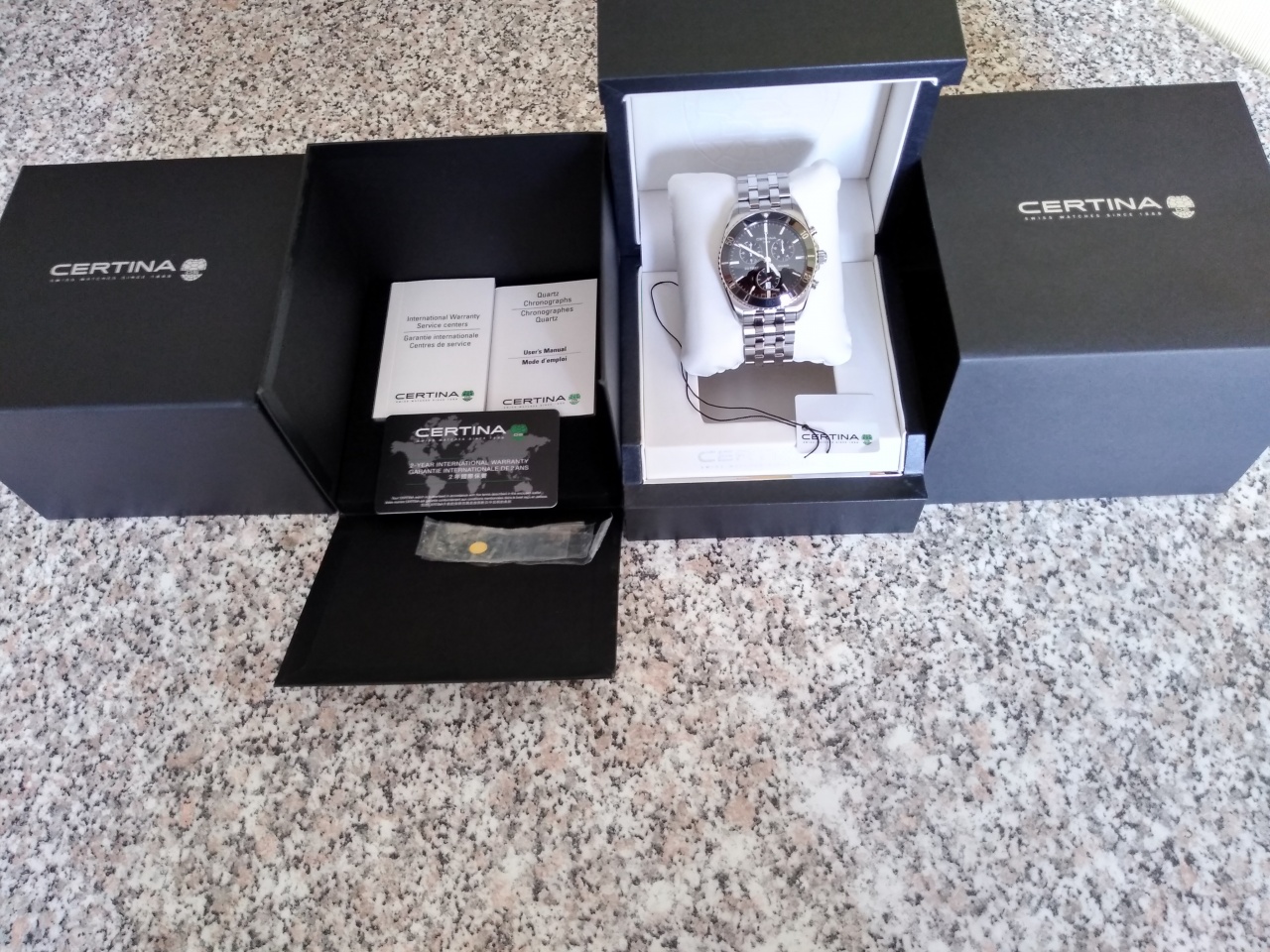 Дайвер 42мм. от Certina в премиальном исполнении.Керамический безель .Выпуклое сапфирое стекло.Глянцевый циферблат.12 часовой четырёх стрелочный секундомер с сплитом и десятыми долями секунды.Литая задняя крышка с объёмным изображением черепахи.WR200м.Сатинированный корпус и браслет.Яркий голубой люм.Часы новые.Одевались на руку один раз при дарении мне.На гарантии оф.дилера 2г.Ритейл 51900р.