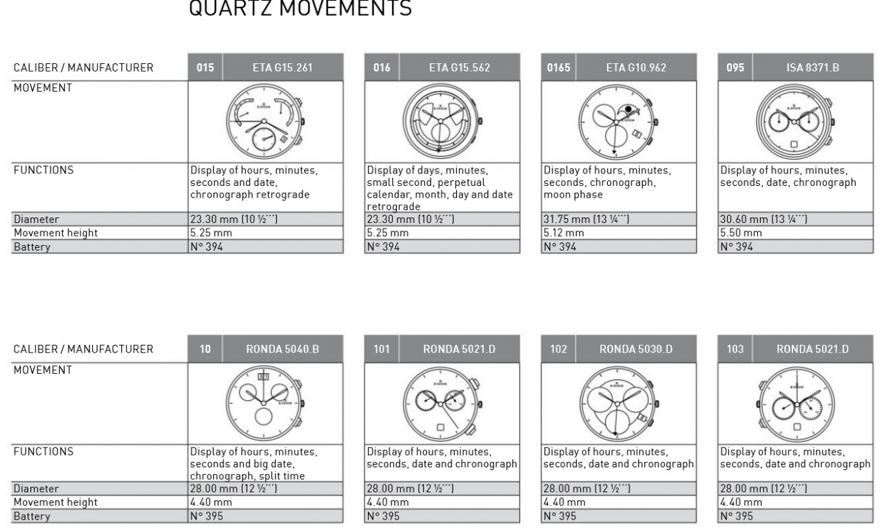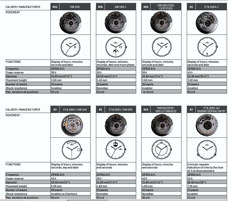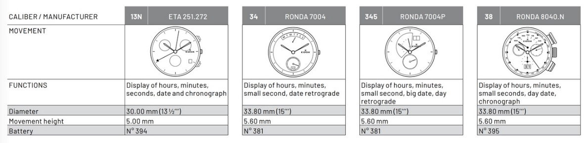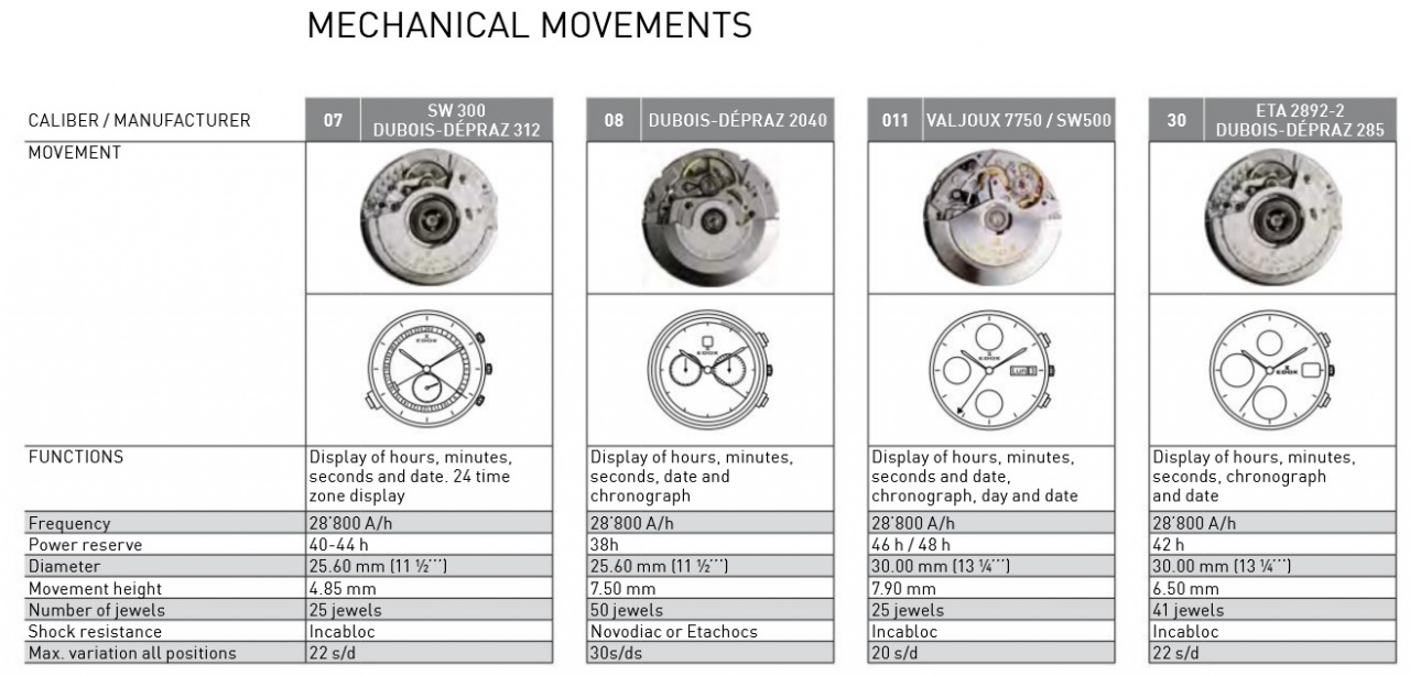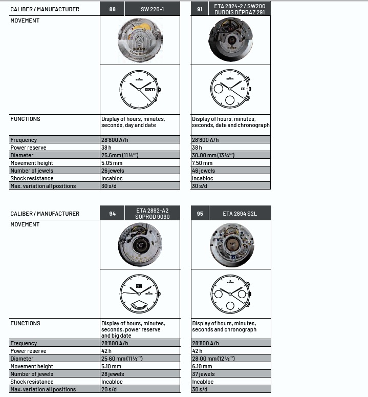 В качестве справочной информации для заинтересованных форумчан размещаю информацию о калибрах, используемых Edox согласно каталогу 2019 года.