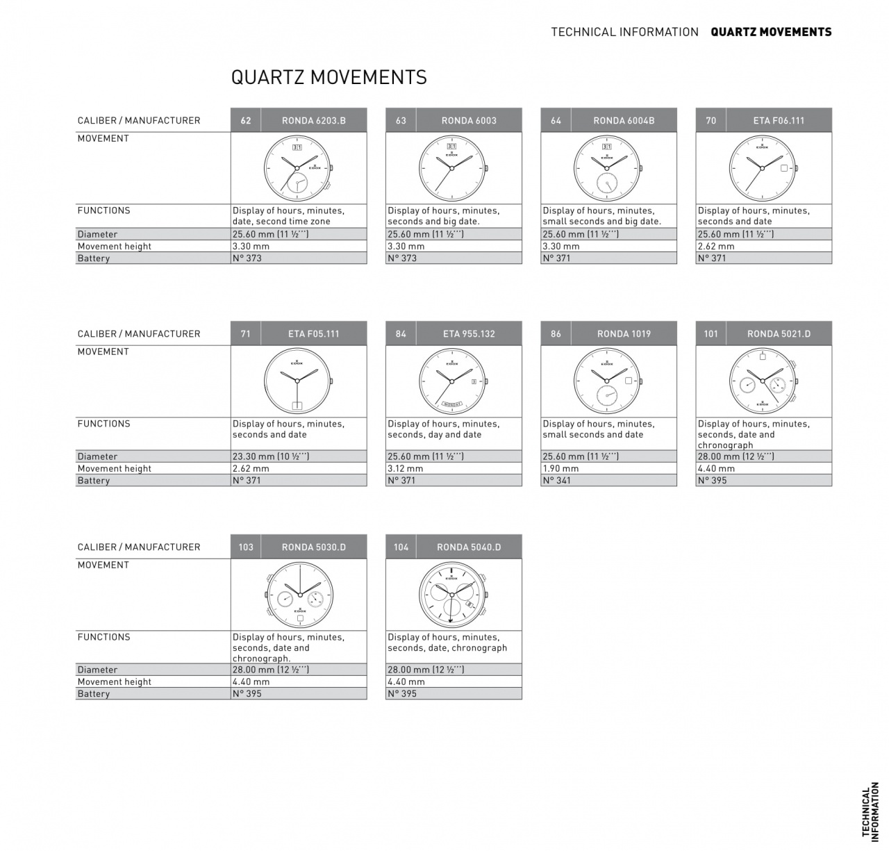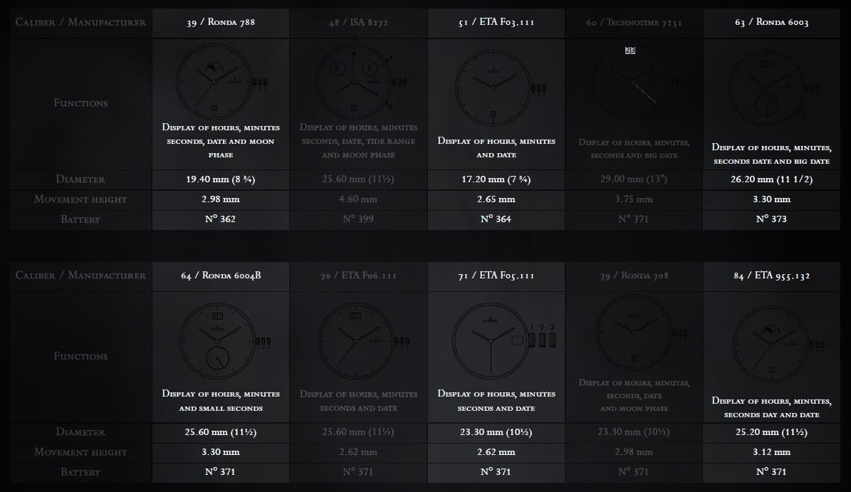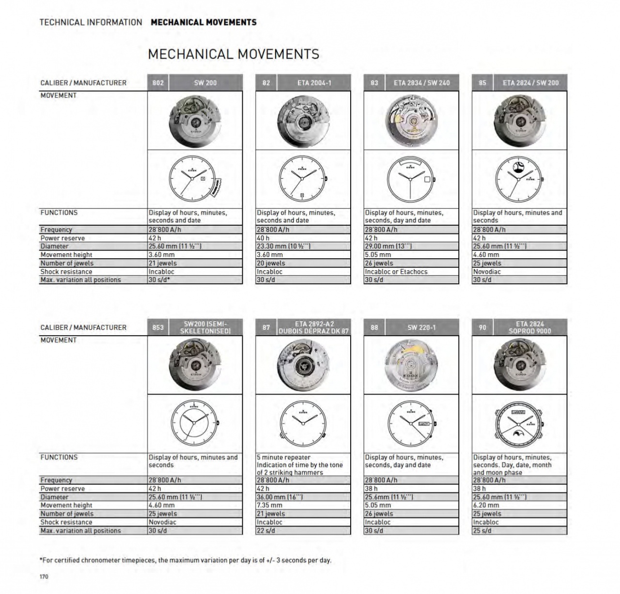 В качестве справочной информации для заинтересованных форумчан размещаю информацию о калибрах, используемых Edox согласно каталогу 2019 года.
