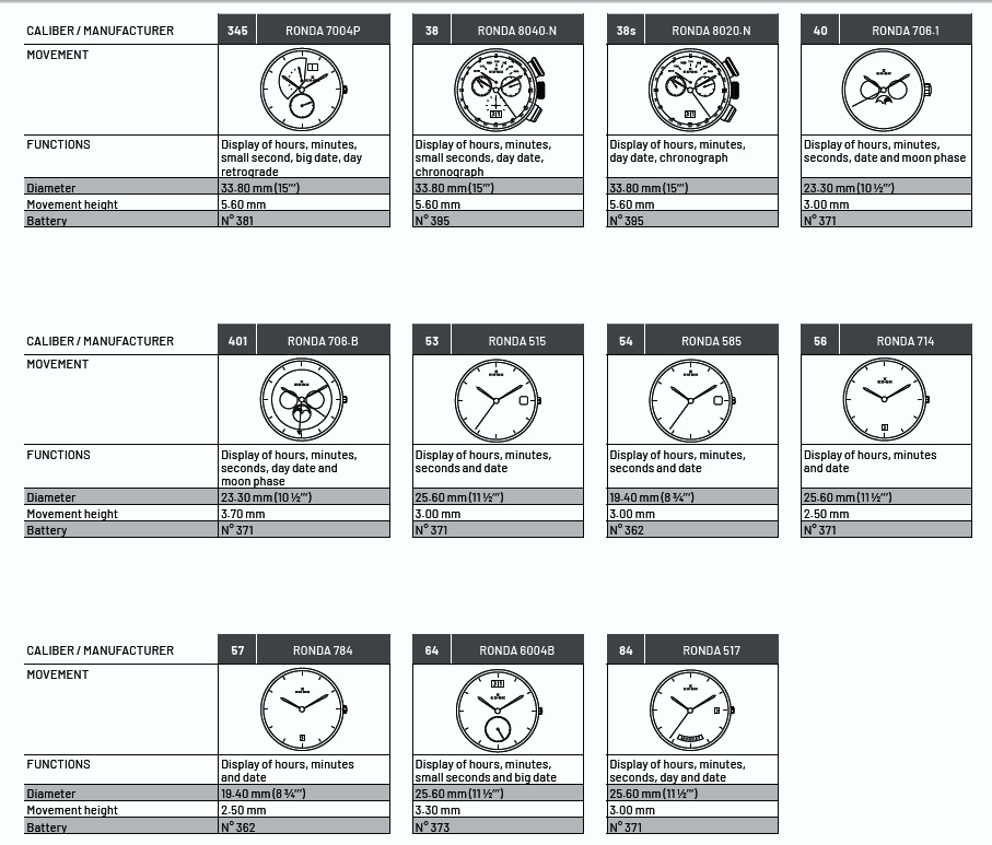 Например, часы Edox SkyDiver 70s Date, реф. 53017 3NM NI, имеют внутреннюю кодировку калибра 53, т.е. в соответствии с таблицей каталога установлена Ronda 515.