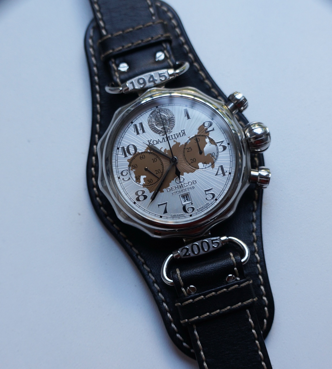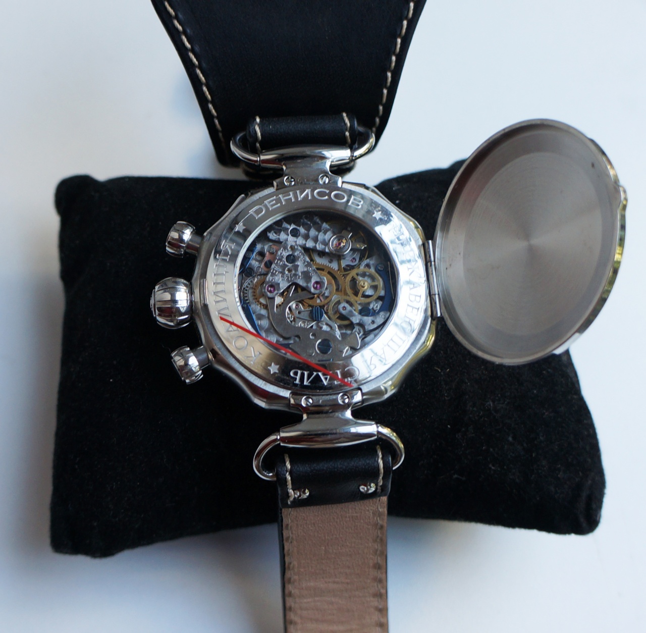 Механизм Полет 3133, механический завод. Функции: часы, минуты, секунды, календарь, секундомер. Стальной корпус, сапфировое стекло. Задняя откидная крышка с изображением Сталина. Часы на крупную руку