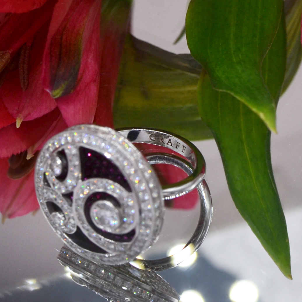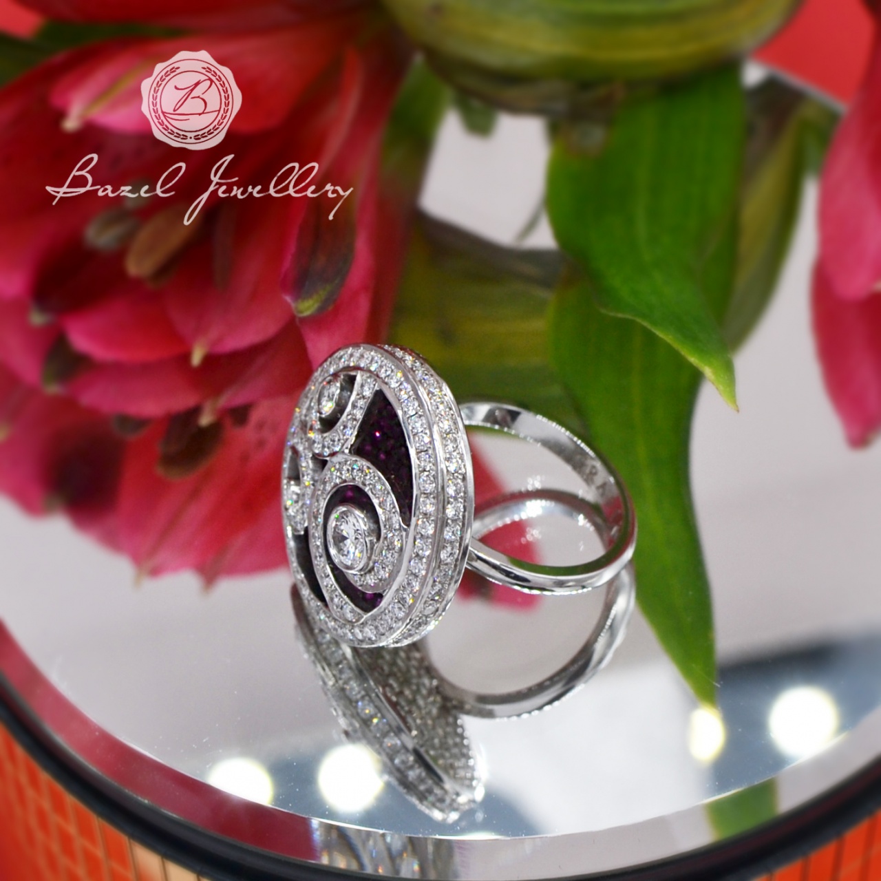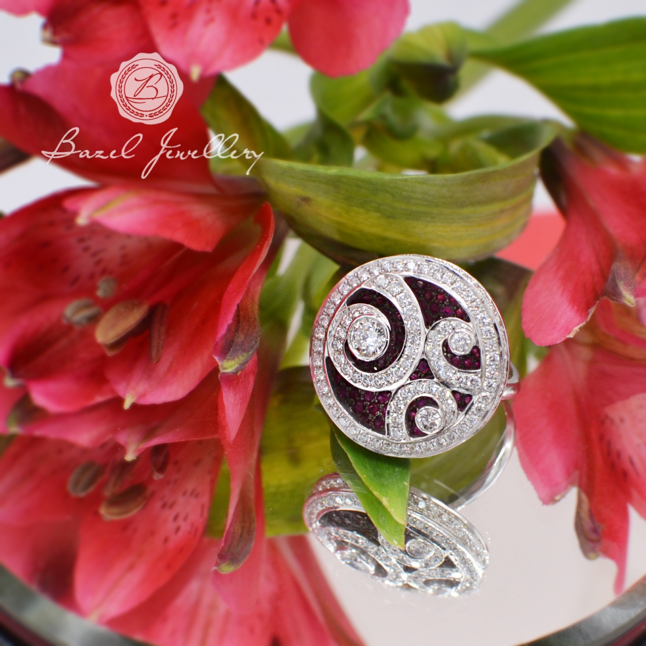 Волшебное кольцо из белого золота, усыпанное бриллиантами и рубинами, пробуждает фантазию.