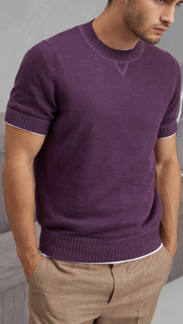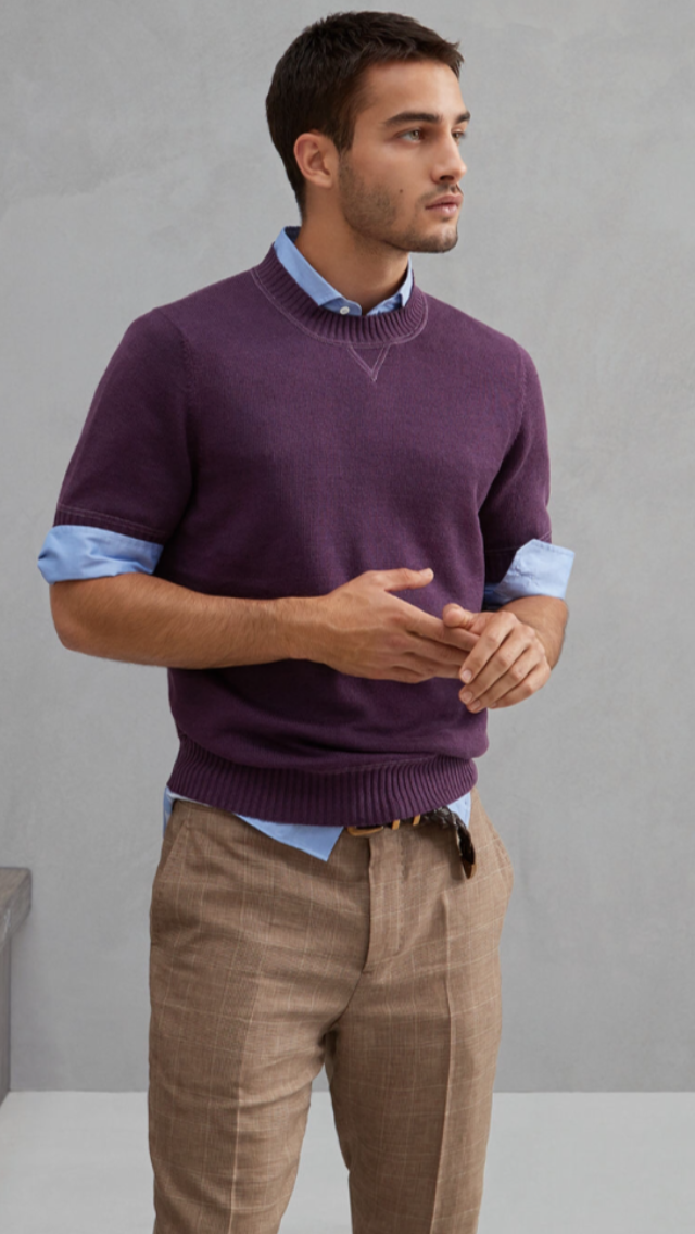 В продаже,новый мужской пуловер кроя Sweatshirt с короткими рукавами, из льна и хлопка, с контрастной строчкой от известной итальянской марки BRUNELLO CUCINELLI.Новый джемпер из ценной хлопковой и льняной пряжи интерпретирует спортивный стиль толстовок. Воротник, манжеты и низ отделаны специальной контрастной стежкой, которые придают поистине изысканный штрих летней модели с короткими рукавами.