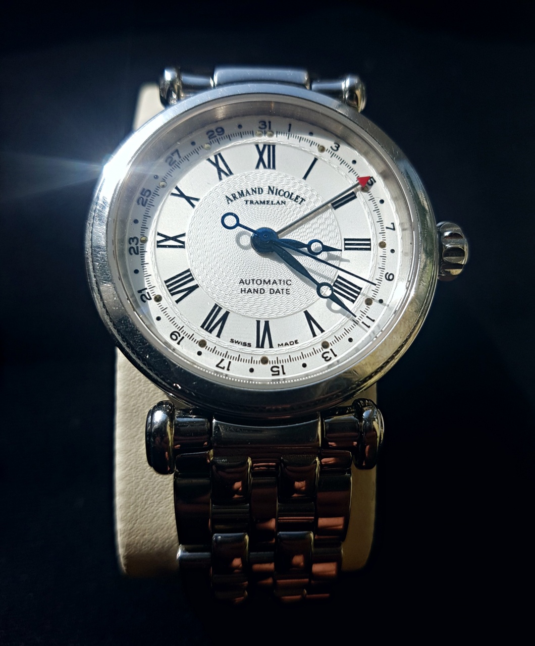 Продам мужские оригинальные часы Арман Николе Швейцария, automatic, сталь - золото ( золотые метки на циферблате ), редкая модель, дату показывает стрелка с красным наконечником, покупались в Австрии. Очень красивые: гильёшированный циферблат, синие вороненые стрелки, сапфировое стекло с антибликовым покрытием двух сторон, золотые метки и надписи на роторе, римские цифры, оригинальный браслет на среднюю руку. Диаметр 40мм, отличное состояние. В комплекте только часы. Обмен не предлагать. Часы находятся в Санкт-Петербурге.